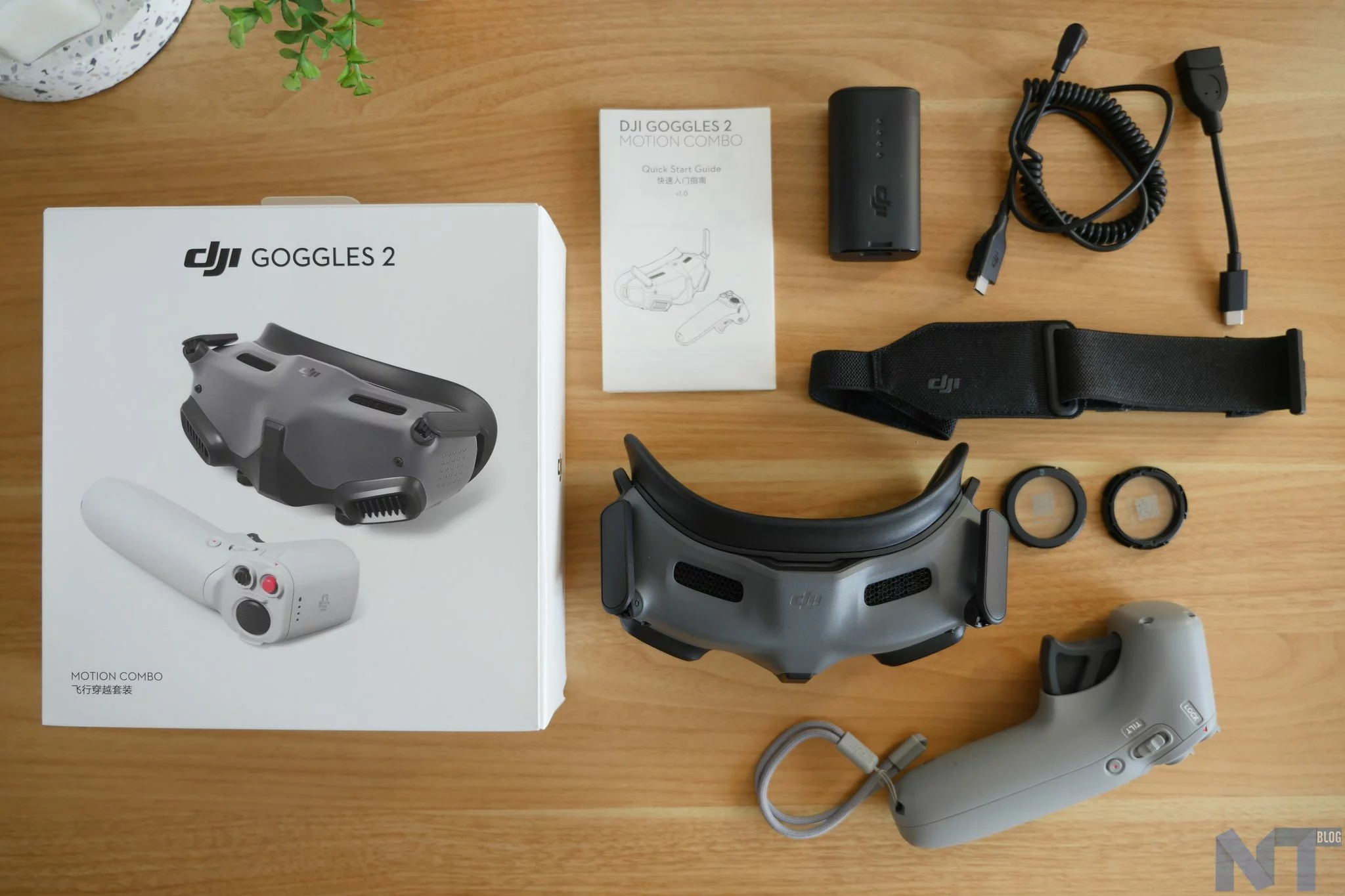L’ensemble DJI Goggles 2 comprend le contrôleur de mouvement DJI, les DJI Goggles 2, la batterie des Goggles, le câble d’alimentation des Goggles, deux objectifs, un adaptateur USB A-C et un manuel d’utilisation.
