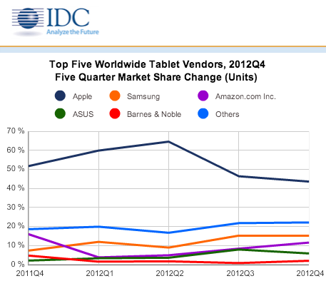 Apple détient toujours 43% du marché de la tablette, ce qui est encore plus que ses quatre plus proches concurrents réunis. Alors que la part de marché pour l’iPad était proche de 65% l’année dernière, sa part de marché a progressé avec l’introduction de plus de tablettes et un nombre croissant de concurrents. Apple a encore vendu plus de 48% de tablettes durant le T4 de l’année dernière, et est confiant pour les ventes de son nouvel iPad Mini et iPad 5 pour 2013.