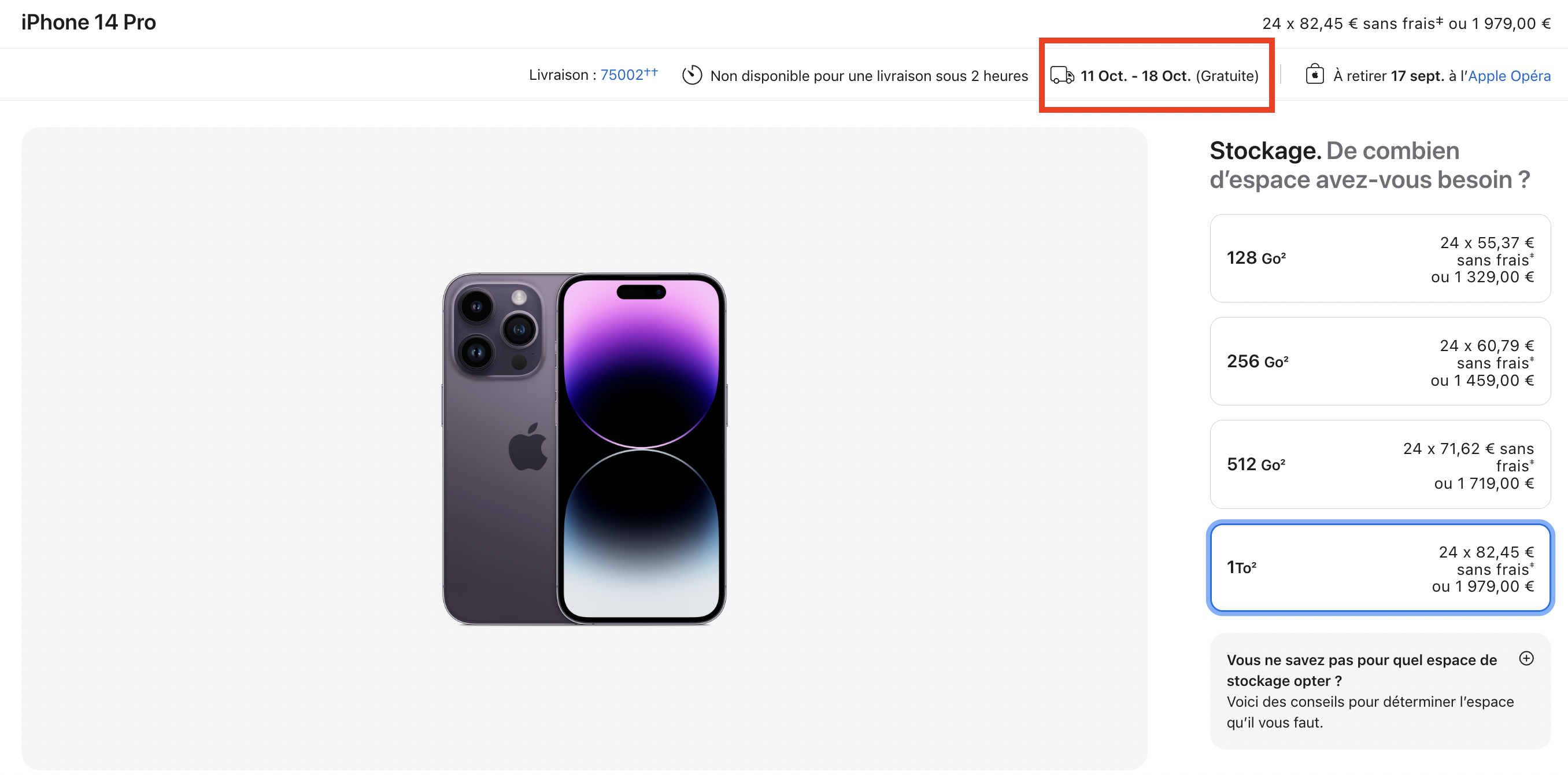 Par exemple, le délai d’expédition pour la version 128 Go de l’iPhone 14 Pro est de « 2 à 3 semaines », ce qui place la date de livraison bien après la date du 16 septembre. Des situations analogues se produisent pour la plupart des modèles d’iPhone 14.