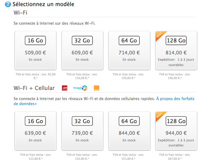 Ce n’est qu’à la fin du mois de janvier, il ne s’agissait alors que d’une énième rumeur, que nous apprenions la sortie d’un possible iPad de 128 Go. En fait, ce n’est que la semaine dernière qu’Apple a rapidement confirmé la rumeur et fait une annonce sur la disponibilité de cette nouvelle gamme pour son traditionnel iPad. Maintenant, nous voici une semaine plus tard, et ils sont d’ors-et-déjà disponibles à l’achat.