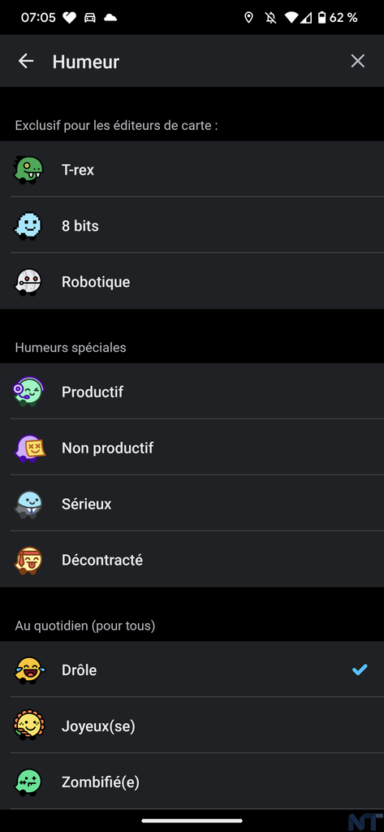 Certes, certaines d’entre elles pourraient être pires que la pire blague de votre collègue, mais certaines sont assez inspirées et je suis sûr que cela suscitera quelques rires. Au-delà de ces accroches amusantes, les utilisateurs de Waze peuvent également sélectionner leur humeur pour les heures de travail : Productif, Non productif, Sérieux et Décontracté.