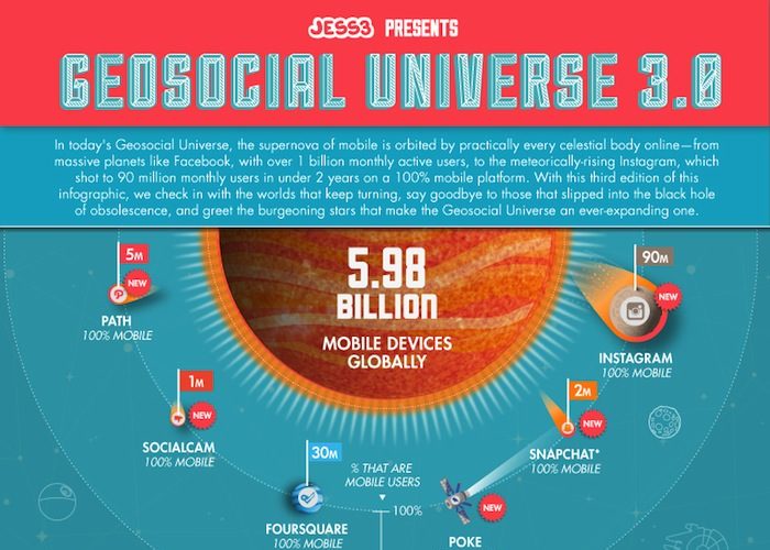 Selon son concepteur Lane Kinkade, “la dernière version met davantage l’accent sur les utilisateurs mobile dans l’univers geosocial”. Alors, quels sont les principaux changements dans les données ? Un afflux d’applications mobiles, pour commencer. Il y a des étoiles montantes : Snapchat et Facebook Poke – représenté comme un satellite espion sournois, pour illustrer ses mystérieuses origines, Socialcam avec 1 million d’utilisateurs actifs par mois, et Path qui détient une base de données de 5 millions d’utilisateurs.