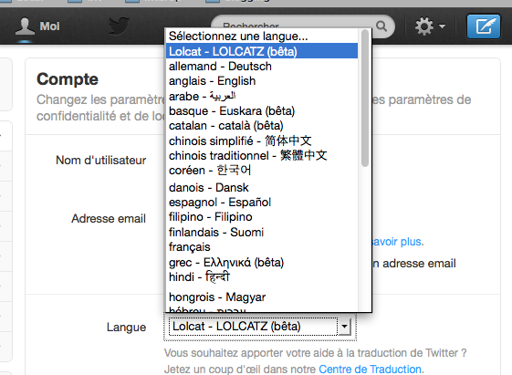 Comme il n’y a vraiment pas un langage standard de Lolcatz sur lequel Twitter peut se référer, les éditeurs de la plateforme ont été malins puisqu’ils ont décidé de traduire les différents caractères anglais dans ce dialecte. Si quelqu’un est en place pour développer le langage standard lolcatz, ou est un expert en ce dernier pour une raison ou une autre, l’option de langue est en mode bêta en ce moment alors n’hésitez pas à envoyer à Twitter un e-mail, ou bien consultez le centre de traduction du service afin d’aider l’équipe. Si vous êtes qualifié pour le faire, sachez que vous avez notre respect éternel 🙂 !