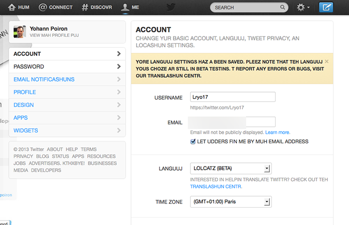 - Sous le “Nom d’utilisateur” et “L’adresse email”, vous verrez un menu déroulant à côté de “Langue”. Cliquez sur Lolcatz, et validez en bas cette préférence en renseignant votre mot de passe