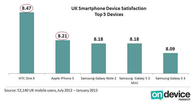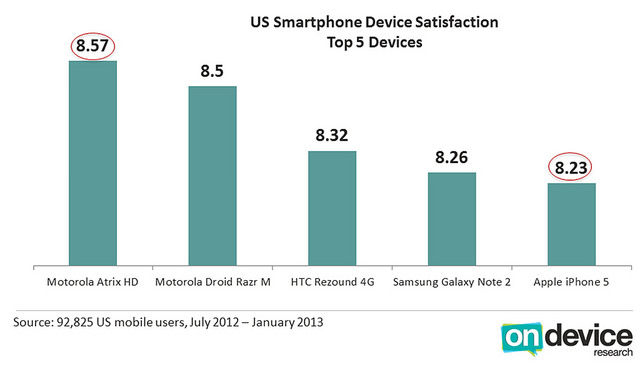 Dans une étude dédiée aux smartphones et aux tablettes sur plus de 320 000 utilisateurs dans six pays – 93.825 aux États-Unis – OnDevice Research a trouvé que les téléphones Android sont les champions des grands marchés mobiles. Aux États-Unis, quatre différents téléphones Android devance l’iPhone 5 d’Apple. Malgré un marquant 8,23 dans la satisfaction des utilisateurs, l’iPhone 5 est coincé derrière le Samsung Galaxy Note 2 de (8,26), le HTC Rezound (8.32), le Motorola Droid Razr M (8,5) et l’Atrix HD (8.57). Le HD Atrix a décroché la première place dans la satisfaction tout en étant la seule véritable offre alléchante sur la liste.