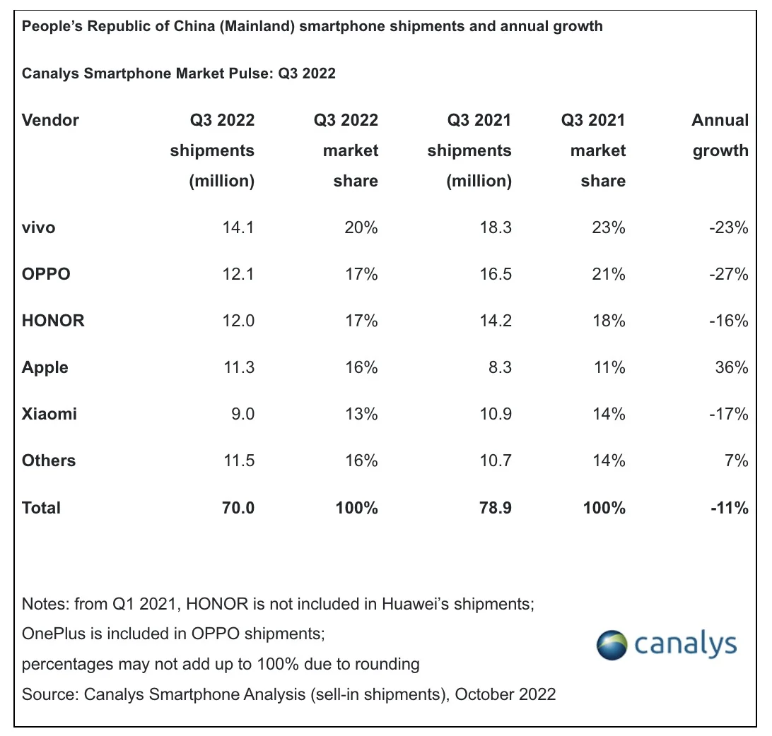 De nouvelles données partagées par Canalys pour la Chine montrent qu’au troisième trimestre de l’année, le marché des smartphones a diminué de 11 % en glissement annuel, toutes les entreprises sauf une enregistrant de fortes baisses. Et, cette entreprise est évidemment Apple.