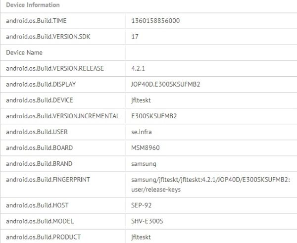 En effet, les gars de Android Authority viennent ajouter de l’eau au moulin dans cette jungle de rumeurs, avec de nouvelles données qui proviennent de la base de données de GLBenchmark, où un mystérieux (ou pas) Samsung SHV-E300S a fait son apparition à travers quelques tests, et ce pour la première fois. Comme le mentionne Android Authority, bien qu’il est encore difficile de conclure qu’il s’agisse à 100% du Samsung Galaxy S4, il ne fait aucun doute qu’il s’agit d’un nouveau dispositif, et que ce dernier pourrait être présenté prochainement. Concernant le nom de code “E300S”, il semblerait qu’il s’agisse de la variante coréenne du GS4 – d’ailleurs connu sous le nom GT-i9500 ou SGH-I337.