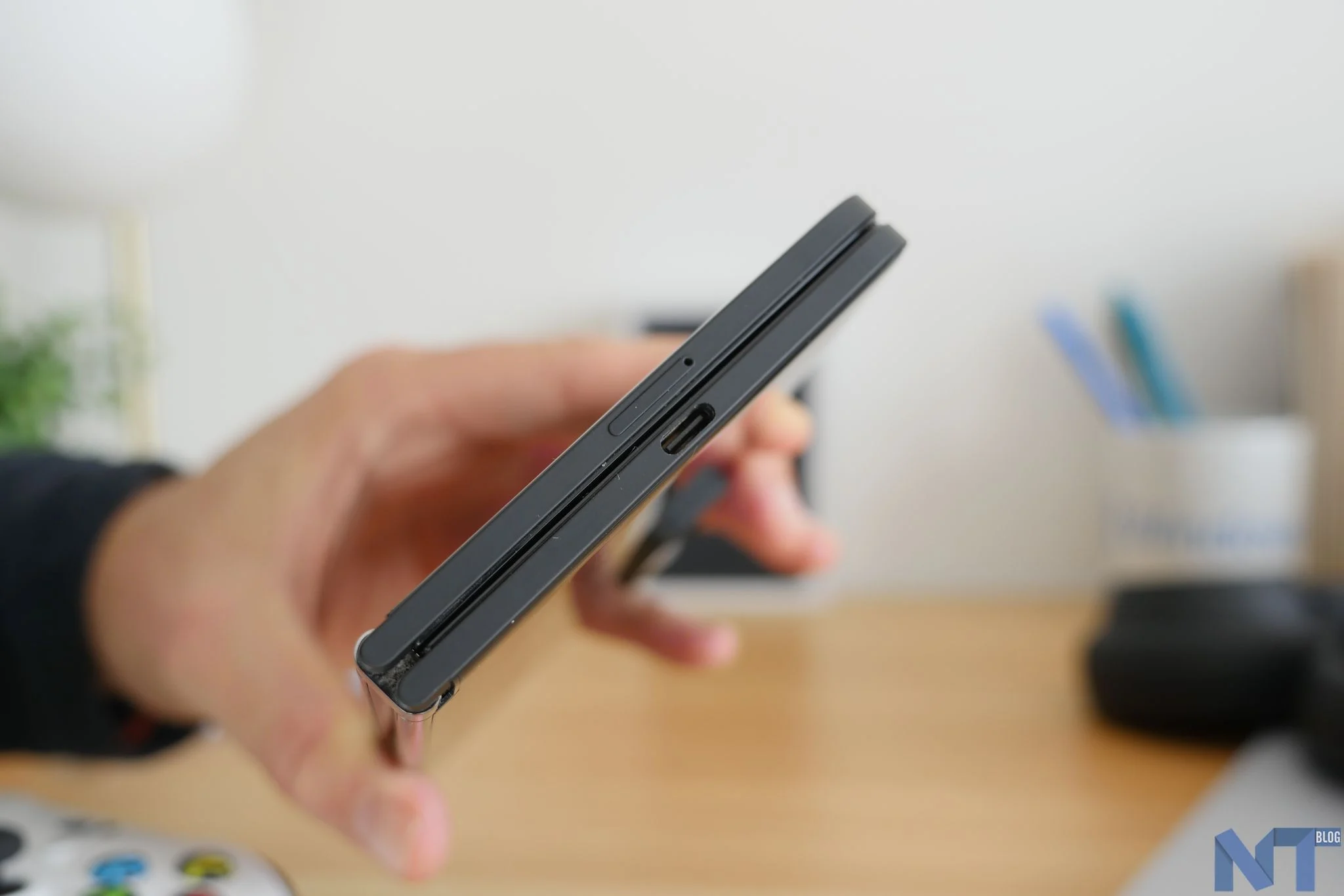 Chaque moitié est d’une finesse impressionnante, avec à peine assez de place pour un port de charge USB-C et un plateau pour carte SIM le long des bords inférieurs. Une fois plié, il est assez petit pour se glisser dans une poche — tout juste. C’est un gadget large, et pas spécialement confortable à utiliser d’une seule main.