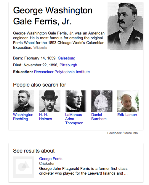 C’est en fait un bon exemple concernant Knowledge Graph qui améliore l’expérience de recherche, en offrant davantage d’informations sur le sujet. Dans ce cas, nous avons la possibilité d’afficher les résultats d’un autre George Ferris qui semble être un joueur de cricket.