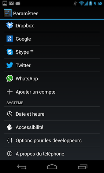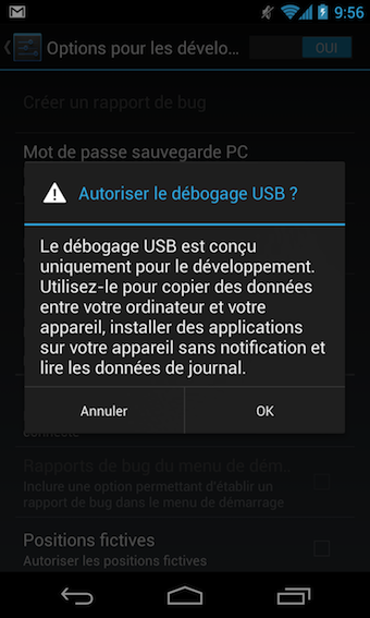 - Accéder aux options développeur de votre appareil Nexus. Pour ce faire, allez dans les paramètres de votre dispositif puis tout en bas vous verrez “Options pour les développeurs”. Si vous ne voyez c’est que votre Nexus 4 n’est pas en mode “Développeur”. Pour l’activer, allez dans la rubrique “À propos du téléphone” et tapez sept de suite sur le numéro de build. Et là, magie le menu apparaît. Une fois en “mode développeur”, activez le débogage USB