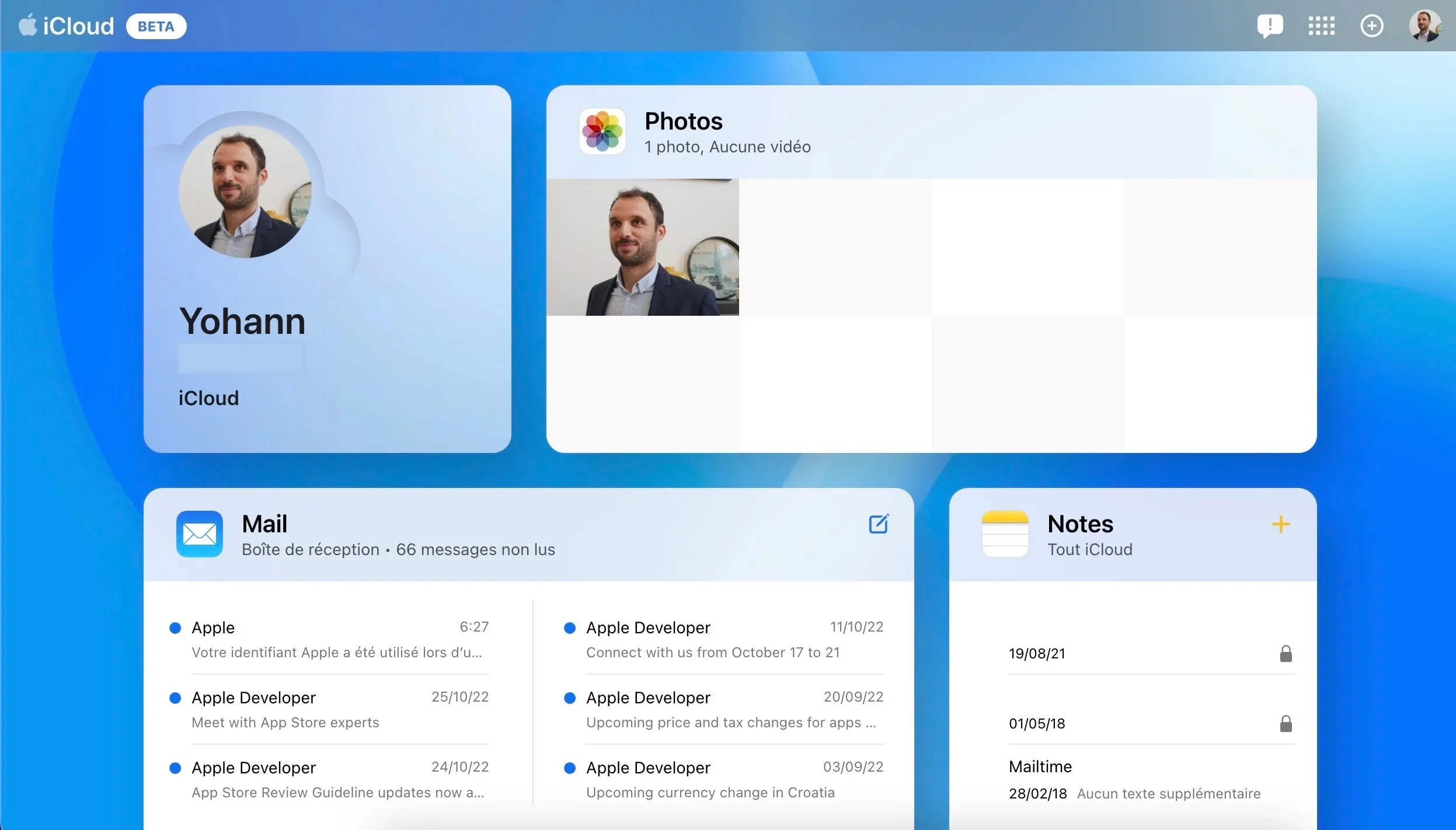 Apple a mis en place un nouveau design pour la page d’accueil d’iCloud.com, que vous voyez immédiatement après vous être connecté. L’ancienne mise en page se résumait à une grille d’icônes pour chaque service, comme Mail, Agenda, Contacts, Photos, iCloud Drive, et ainsi de suite, mais la nouvelle version présente plus de données visibles sans ouvrir une application Web spécifique. Des blocs de type widget, appelés « tuiles », peuvent afficher des images et des listes directement sur la page d’accueil.