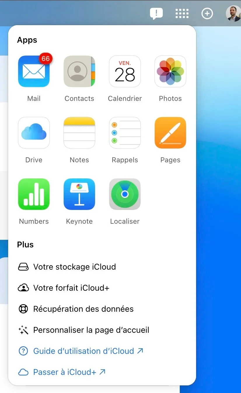 Un bouton « Personnaliser la page d’accueil », situé en bas de la page, permet d’ajouter ou de supprimer des tuiles de la page. Des tuiles sont disponibles pour Photos, Mail, Drive, Notes, Agenda, Numéros, Pages, Rappels et Keynote. Apple propose également une grille standard d’icônes d’applications, soit dans la tuile « apps », soit dans le menu contextuel qui apparaît lorsque vous cliquez sur le bouton de la grille en haut à droite.