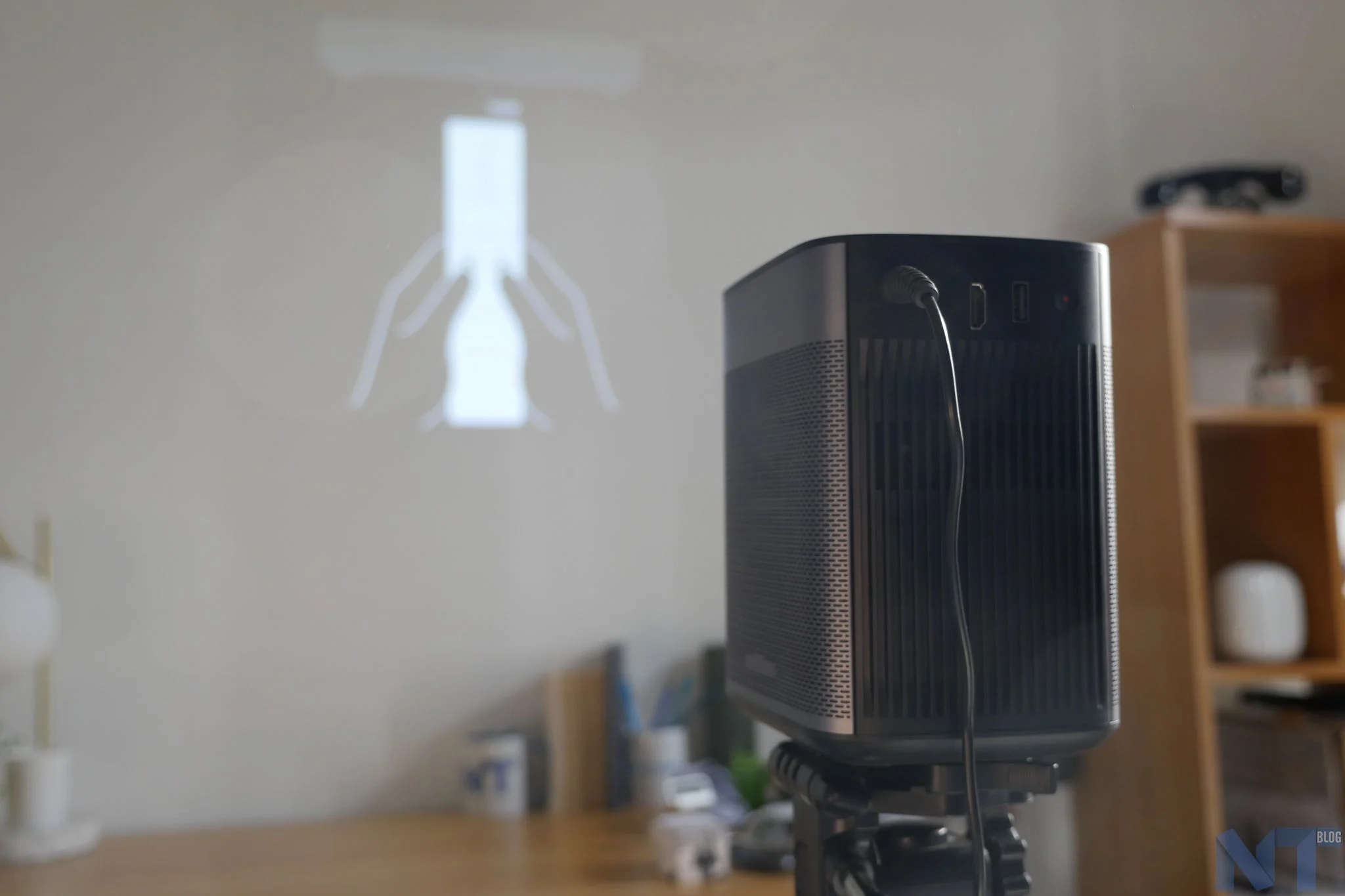 Malgré sa forme cubique verticale, il est d’une stabilité impressionnante. Même lorsque je l’ai placé sur une étagère branlante, il n’a montré aucun signe de tremblement ou de vacillement. L’image projetée n’a pas non plus été perturbée. J’ai constaté que certains projecteurs portables sont obligés de réajuster leur mise au point chaque fois que la surface sur laquelle ils se trouvent tremble, mais celui-ci ne bronche même pas.