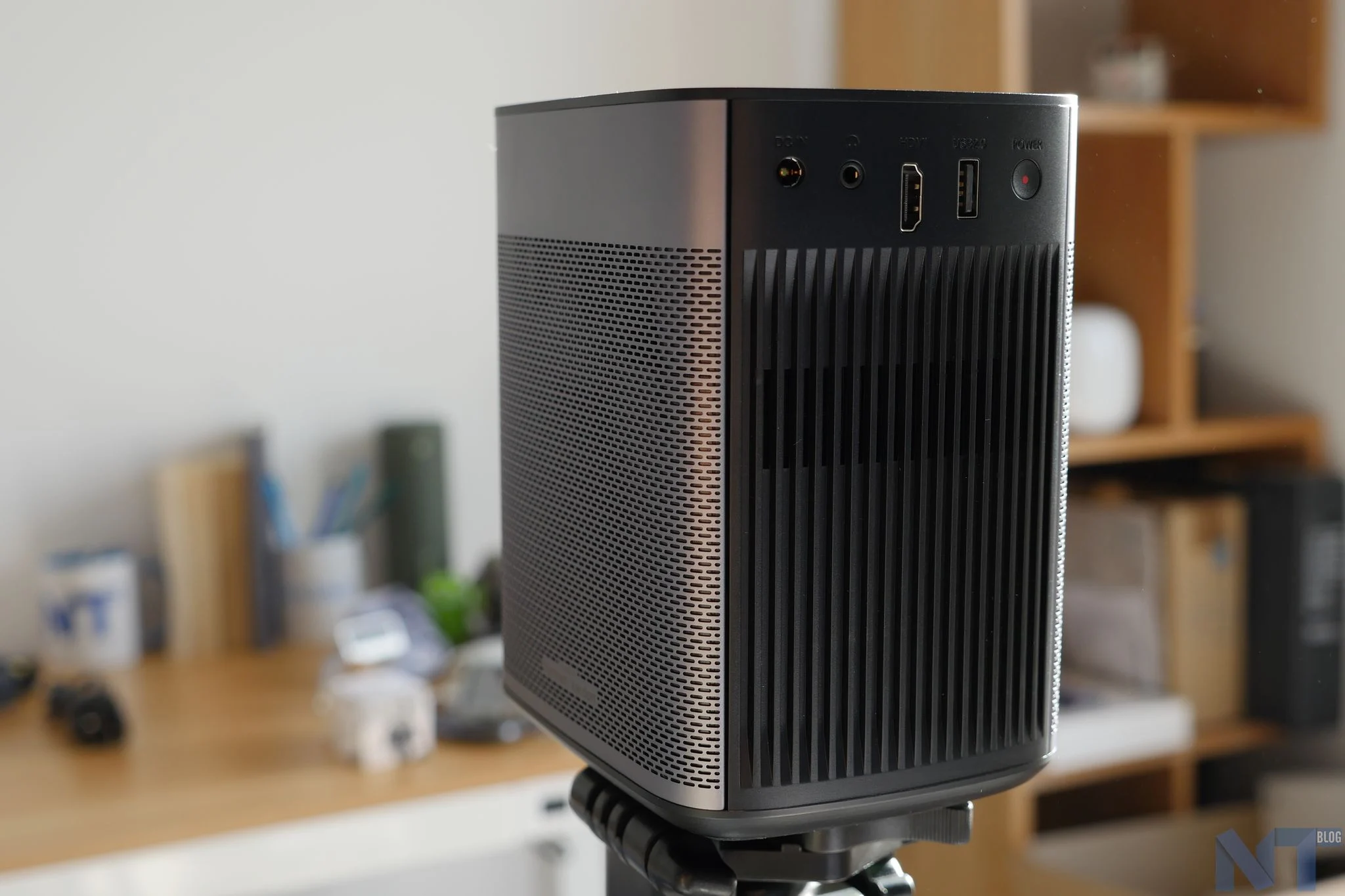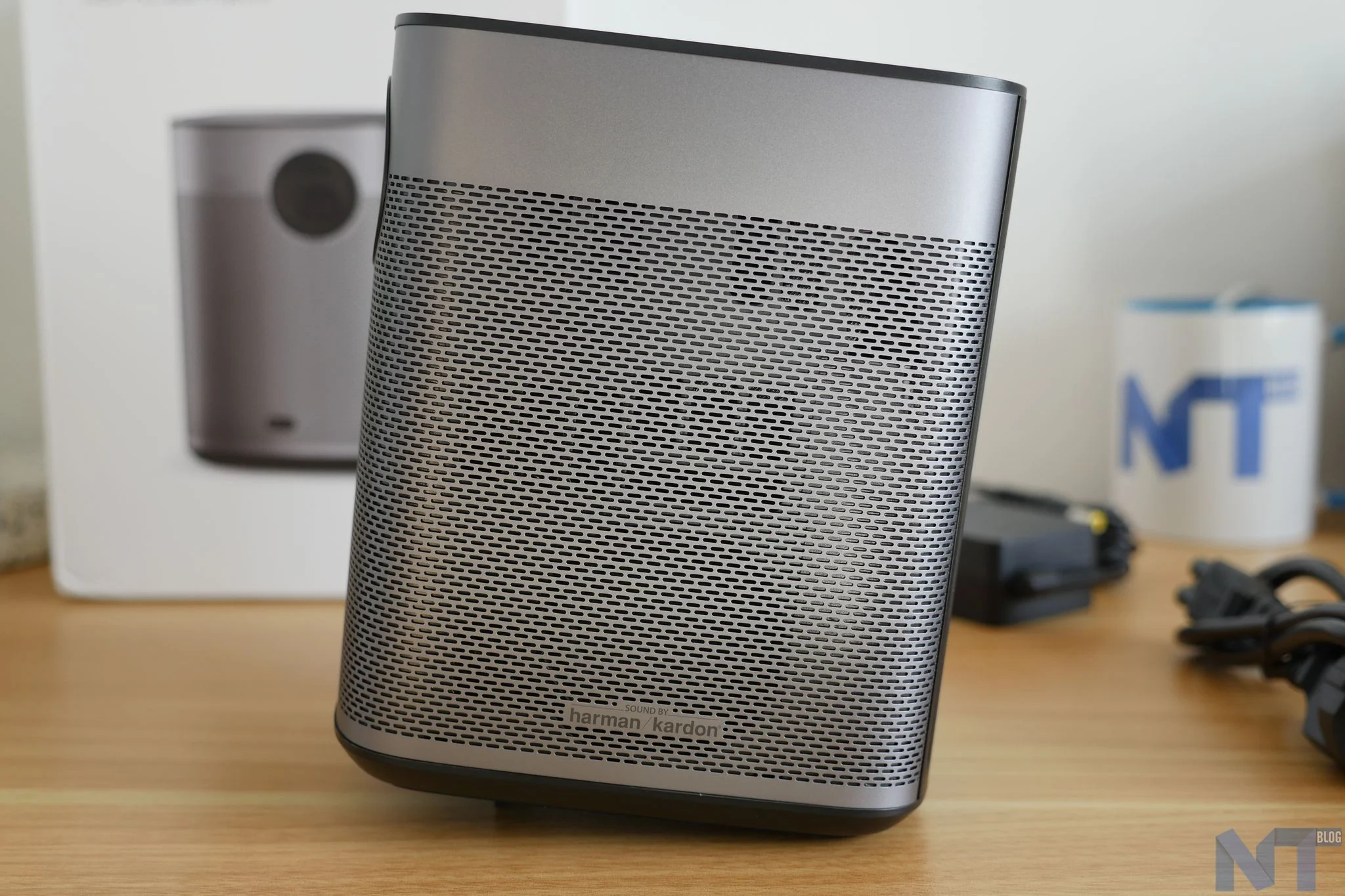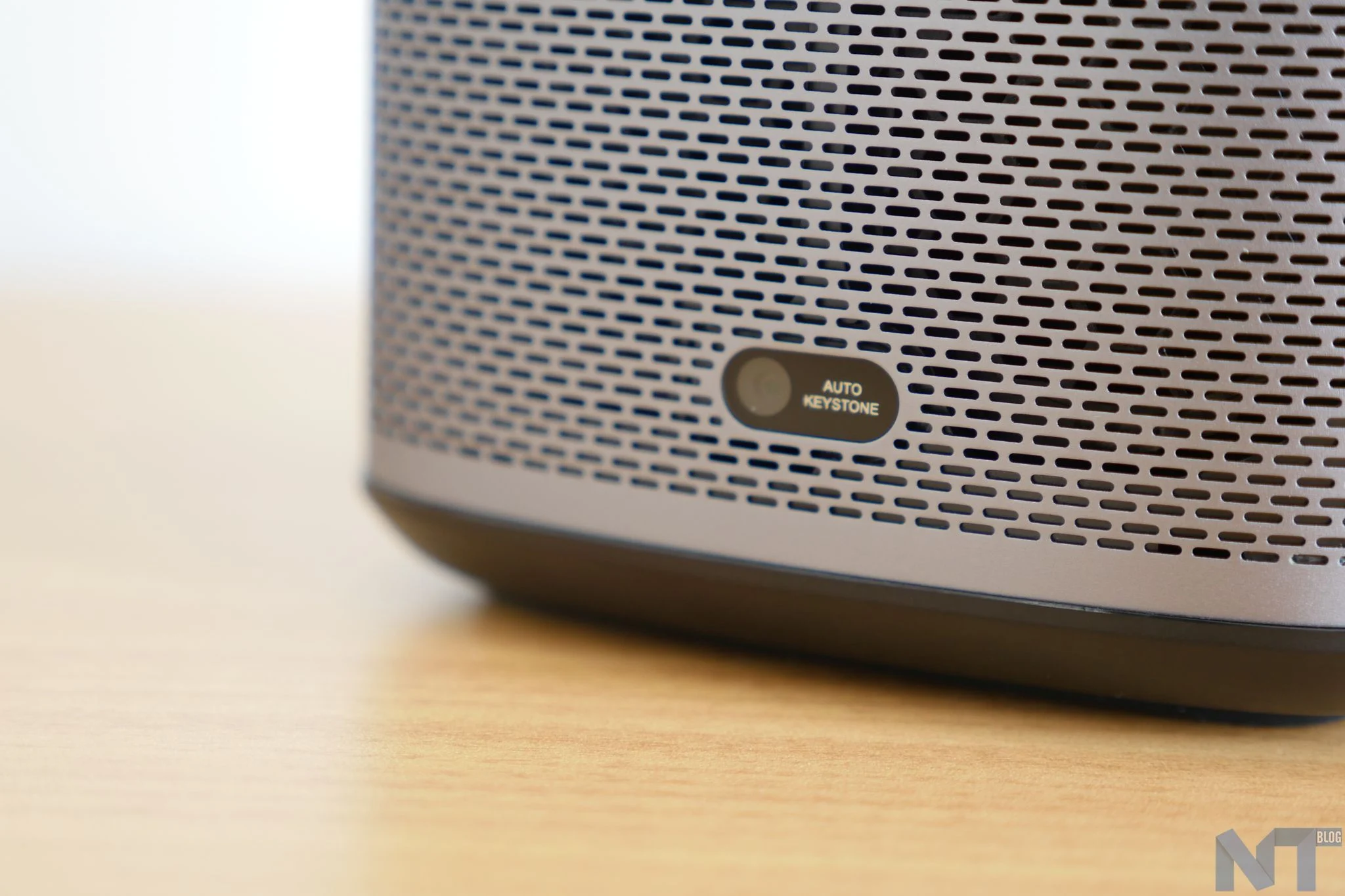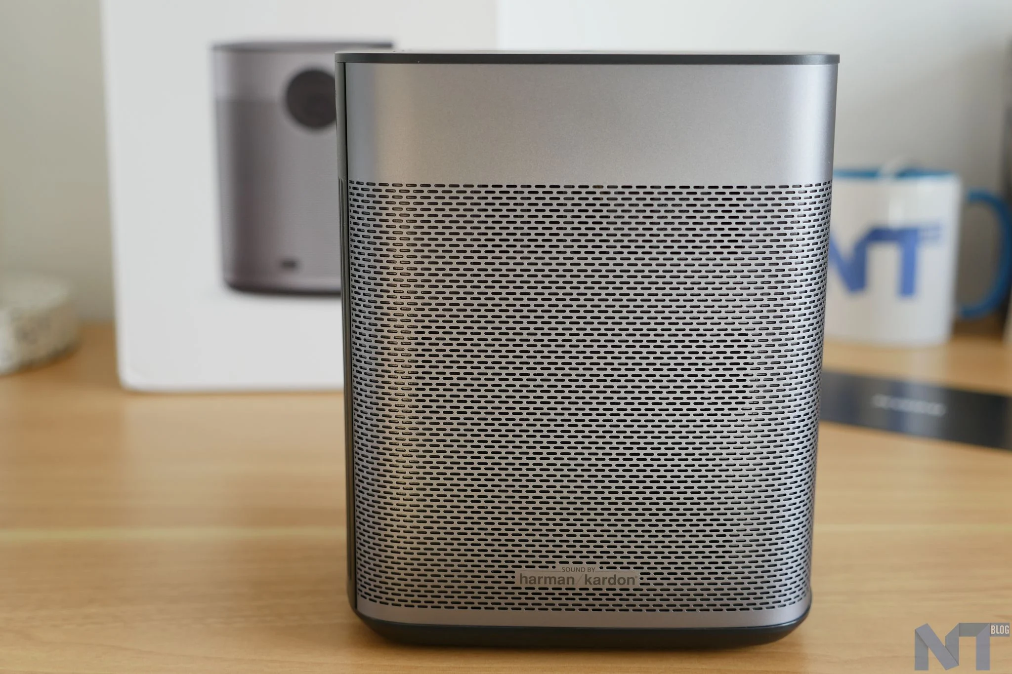 Il est doté d’une grille à trois côtés qui fait partie de son système de haut-parleurs intégré, permettant à ses deux haut-parleurs Harman Kardon de 5W d’offrir une expérience audio à 180 degrés. Il ne reste plus que le panneau arrière pour accueillir la bouche d’aération, qui est étonnamment petite. Non pas que le projecteur en ait besoin. Il gère très bien la chaleur et reste frais même lorsqu’il est sous pression. Et, bien que ses ventilateurs intérieurs soient un peu bruyants, ils ne le sont pas assez pour submerger les haut-parleurs et gâcher votre expérience.