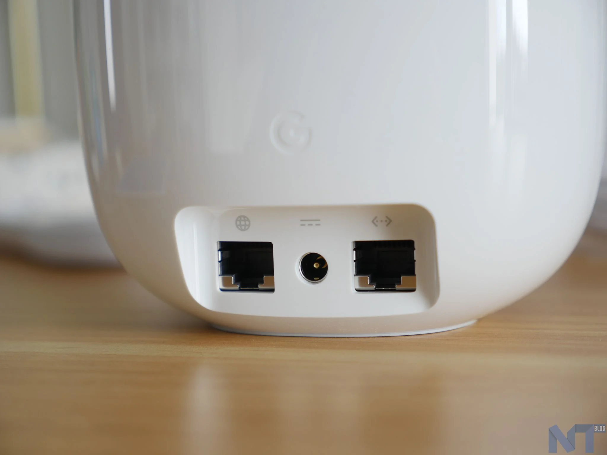 Le Nest WiFi pro est disponible en plusieurs coloris, dont Snow, Linen, Fog, et Lemongrass. Comme vous pouvez le voir dans la suite de cet article, j’ai reçu le modèle blanc. A l’arrière, on trouve trois ports simples — un port d’alimentation, et deux ports Ethernet.