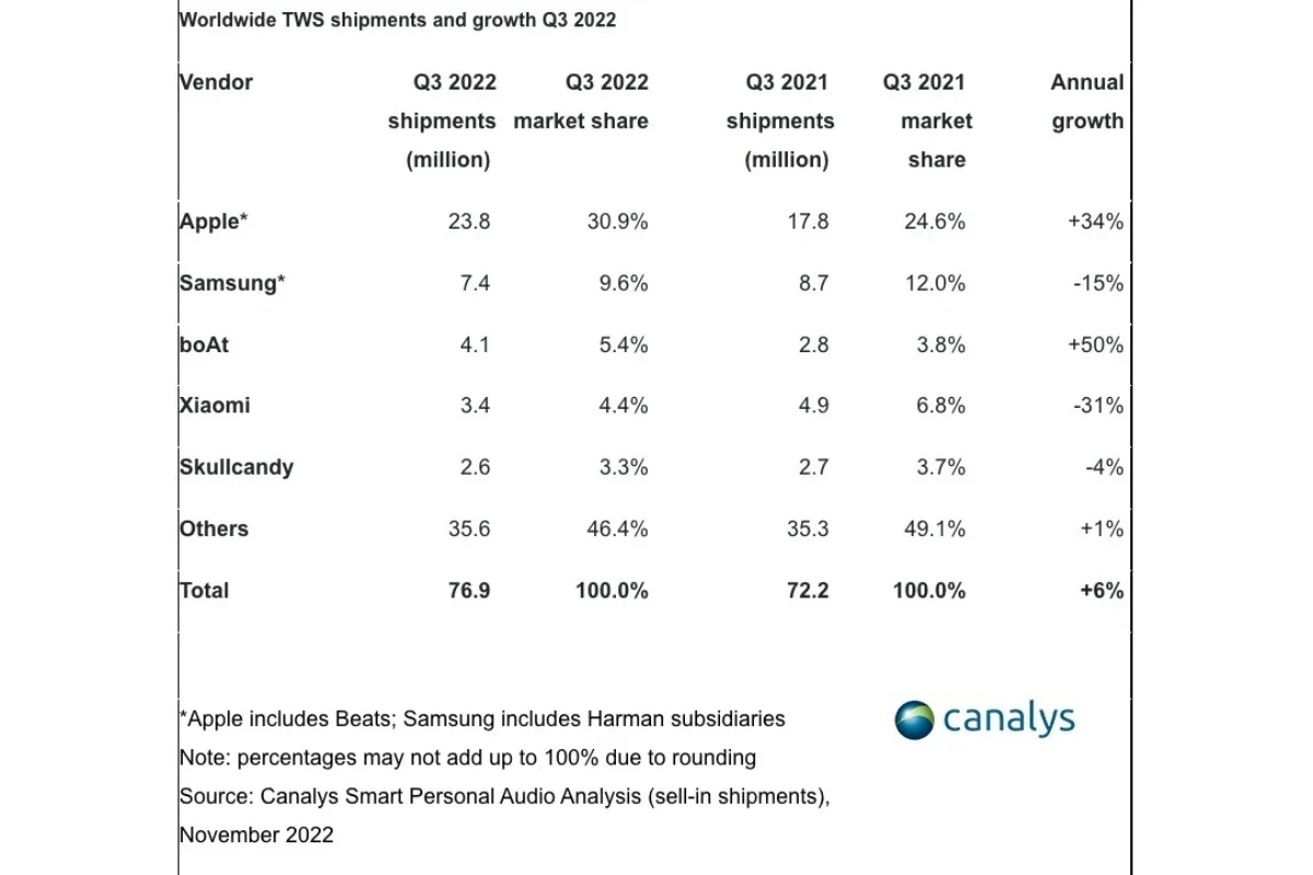 Si vous pensiez que la domination écrasante d’Apple sur le marché mondial des smartwatches « haut de gamme » entre juillet et septembre 2022 était impressionnante (ce qui était absolument le cas), préparez-vous à vous faire époustoufler (à nouveau) par les derniers chiffres trimestriels de ventes de véritables écouteurs sans fil.