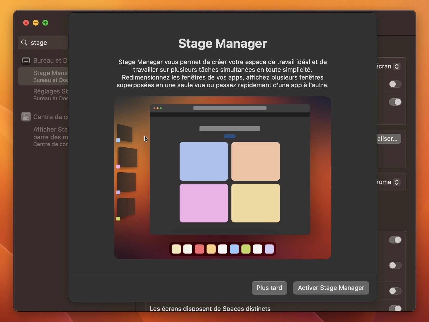 Notez que si votre Dock se trouve sur le côté gauche, Stage Manager sera déplacé vers la droite. De même, si une fenêtre se trouve sur le côté de l’écran, Stage Manager sera toujours disponible, mais vous devrez passer le curseur sur le bord du bureau pour le faire apparaître.