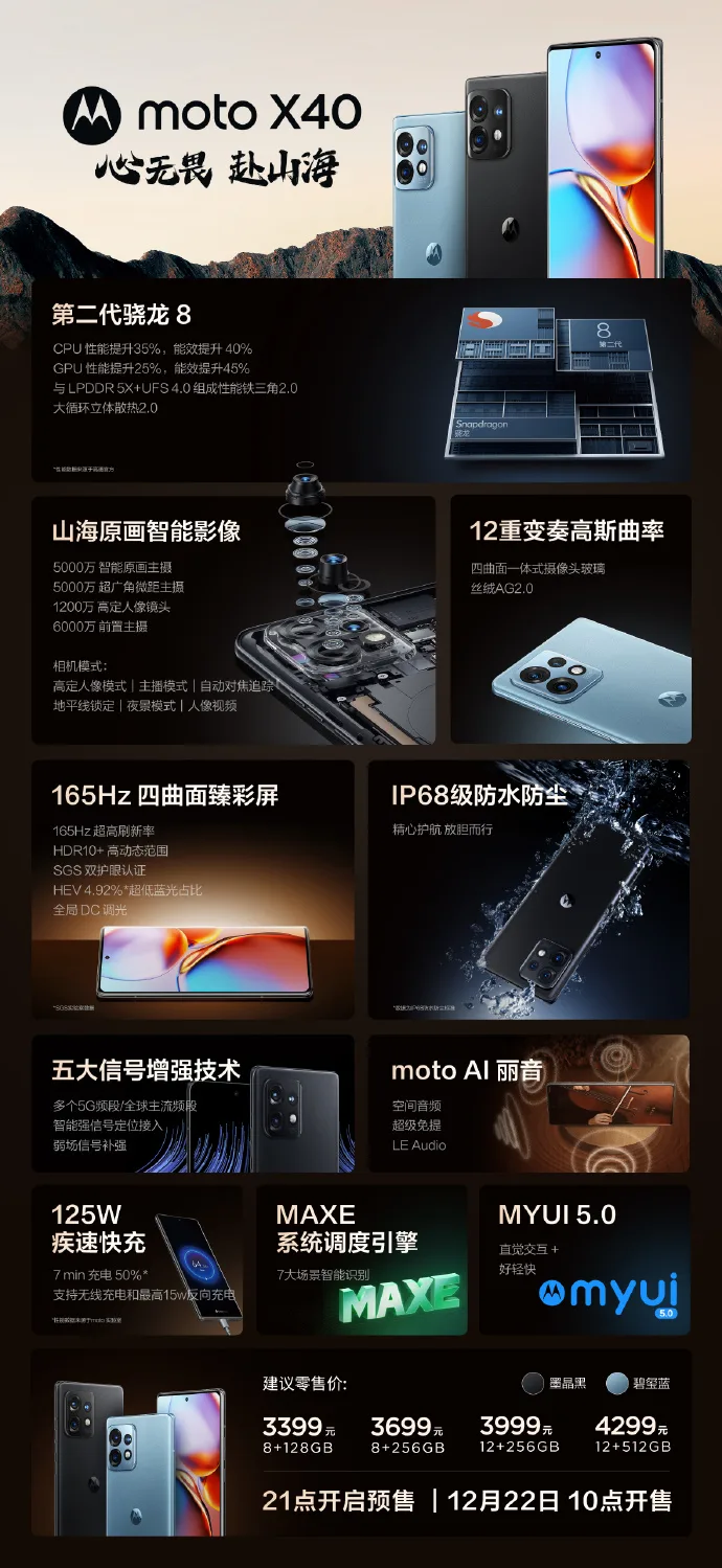 Le prix du Moto X40 est de 3 399 CNY (~ 460 euros) pour le modèle 8 Go et 128 Go, 3 699 CNY (~ 500 euros) pour le modèle 8 Go + 256 Go, 3 999 CNY (~ 540 euros) pour la variante 12 Go + 256 Go, et 4 299 CNY (~ 580 euros) pour le modèle 12 Go + 512 Go. Il est disponible en précommande en Chine et sera disponible au 22 décembre.