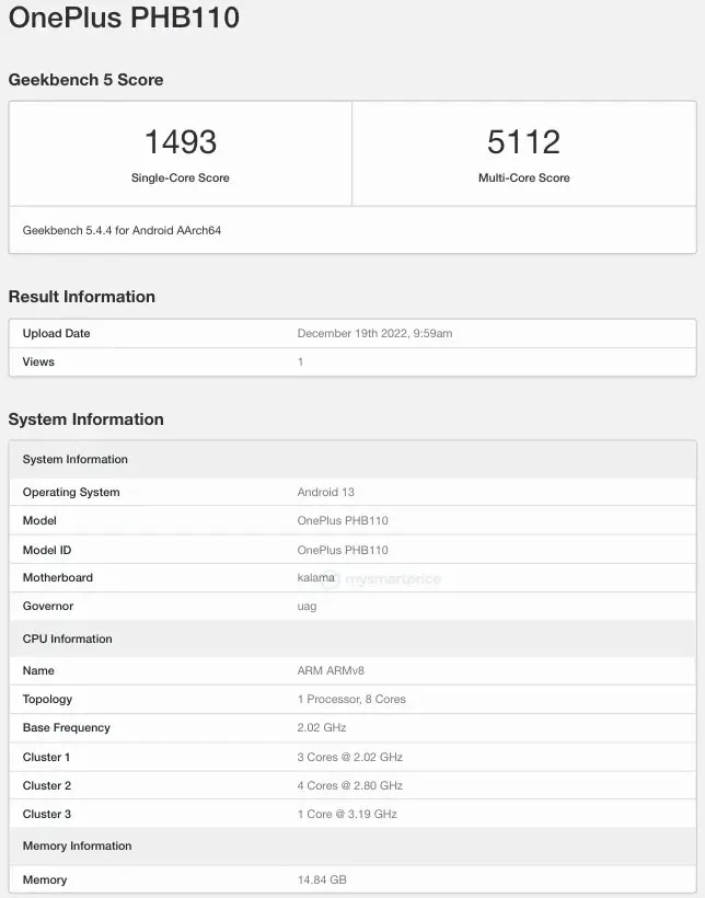 En ce début de semaine, des nouvelles ont éclaté au sujet du OnePlus 11 5G ; le prochain modèle OnePlus sera dévoilé le 7 février. Et, MySmartPrice rapporte qu’un test de benchmark Geekbench « confirme » que l’appareil, numéro de modèle PHB110, sera alimenté par le nouveau SoC Snapdragon 8 Gen 2. Le test montre également que l’appareil aura une option comprenant 16 Go de RAM (les autres options les plus susceptibles d’être proposées sont 8 Go et 12 Go de RAM).