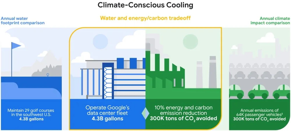 Dans un article du 21 novembre, Google a déclaré qu’elle a utilisé plus de 16,3 milliards de litres d’eau dans ses centres de données à travers le monde en 2021, dont 12 milliards aux États-Unis, selon de nouveaux chiffres. Google affirme que cette consommation d’eau est analogue à celle de 29 terrains de golf aux États-Unis. Elle a également affirmé que ces chiffres n’incluent pas l’eau de mer qu’elle utilise.
