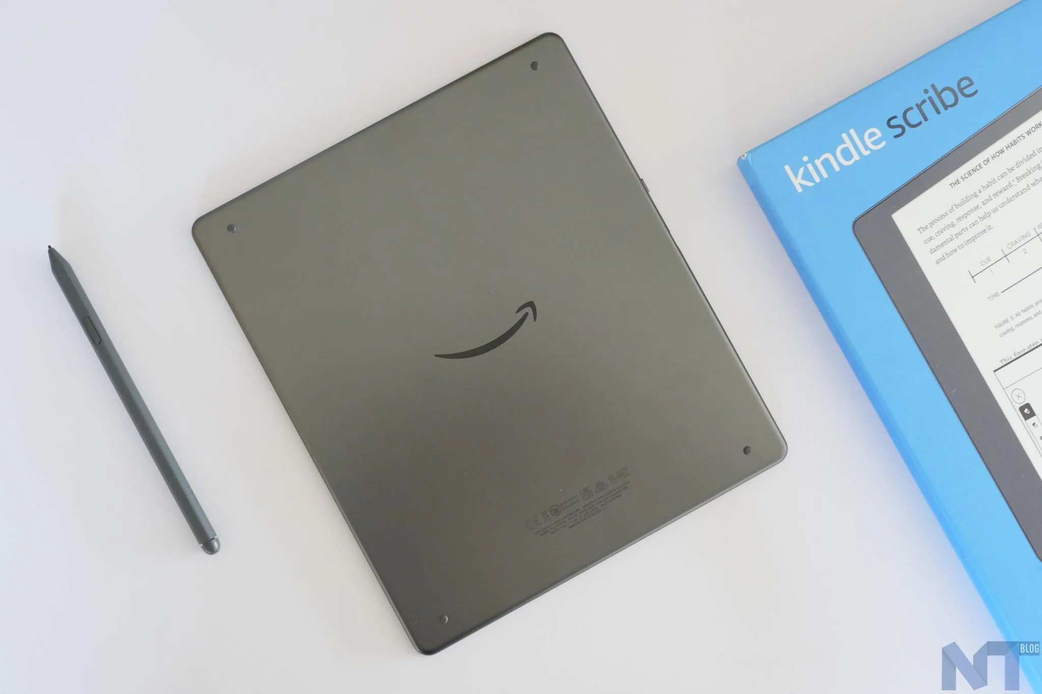 Il n’y a rien de très tape-à-l’œil dans le design du Kindle Scribe. Il est élégant, minimaliste, et est exécuté de manière incroyablement bien à tous les niveaux. Le dos de l’appareil est fait d’aluminium et agréable au toucher. Il n’y a pas grand-chose à voir, si ce n’est le logo Amazon au milieu et quatre pieds en caoutchouc dans chaque coin.
