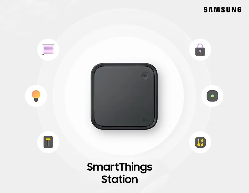 - Application mobile SmartThings : Un hub de maison connectée permet aux thermostats, à l’éclairage et aux prises de courant de se connecter au serveur de la maison connectée afin qu’ils fonctionnent tous ensemble. La SmartThings Station automatise les routines de l’application SmartThings tout en supprimant la nécessité de contrôler les appareils physiques.