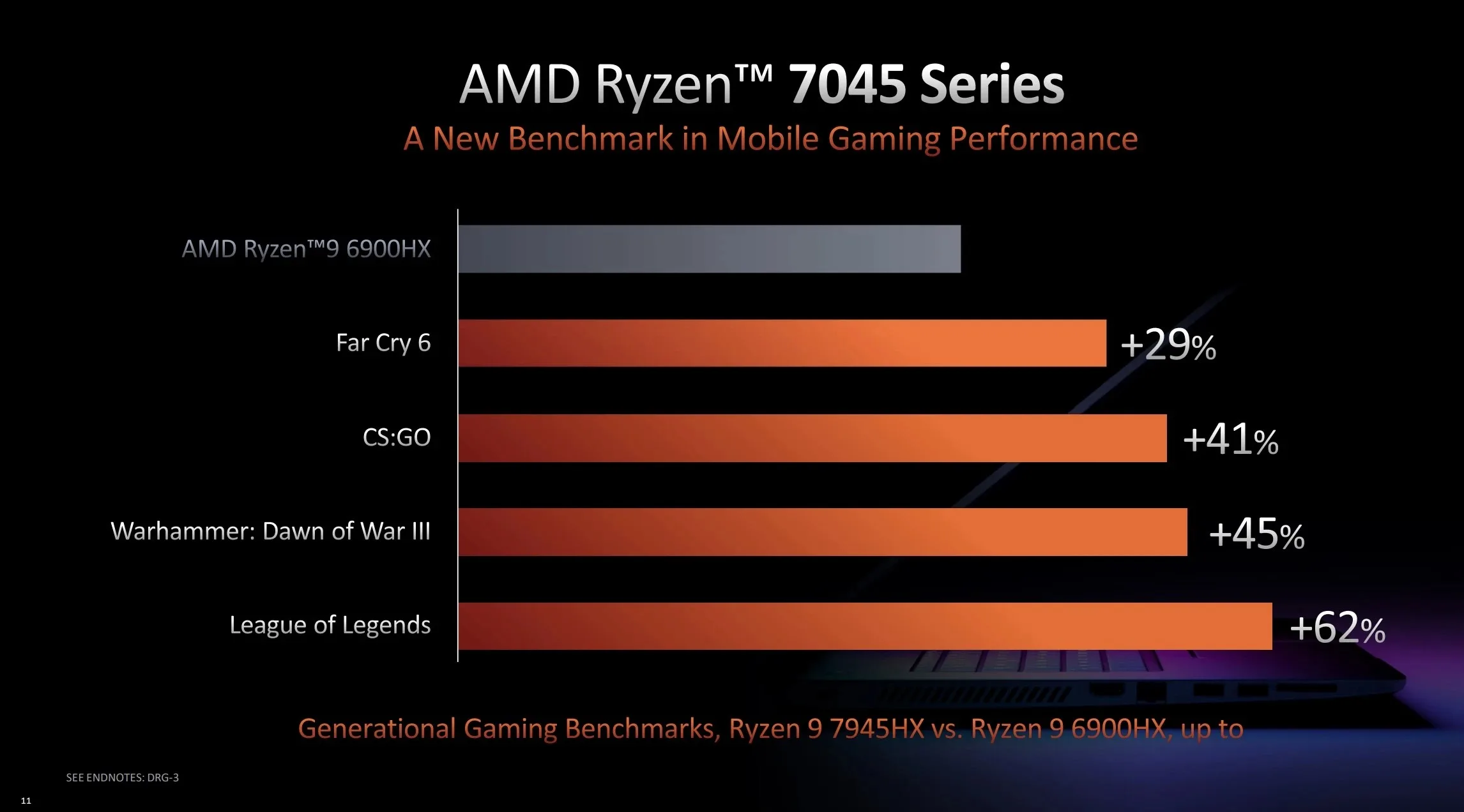 En termes de performances, AMD affirme que le Ryzen 9 7945HX est 78 % plus rapide que le 6900HX de dernière génération en productivité et en multitâche, et le CPU a également enregistré des gains massifs dans les jeux. AMD compare également le 7945HX au Core i9-12900HX d’Intel, en montrant des tests qui placent l’AMD Ryzen 7045HX loin devant Intel, allant d’un gain de 24 % à 169 %. Cependant, il est important de noter qu’Intel vient d’annoncer ses processeurs mobiles Raptor Lake au CES également.