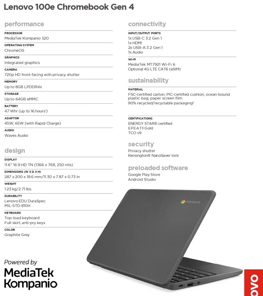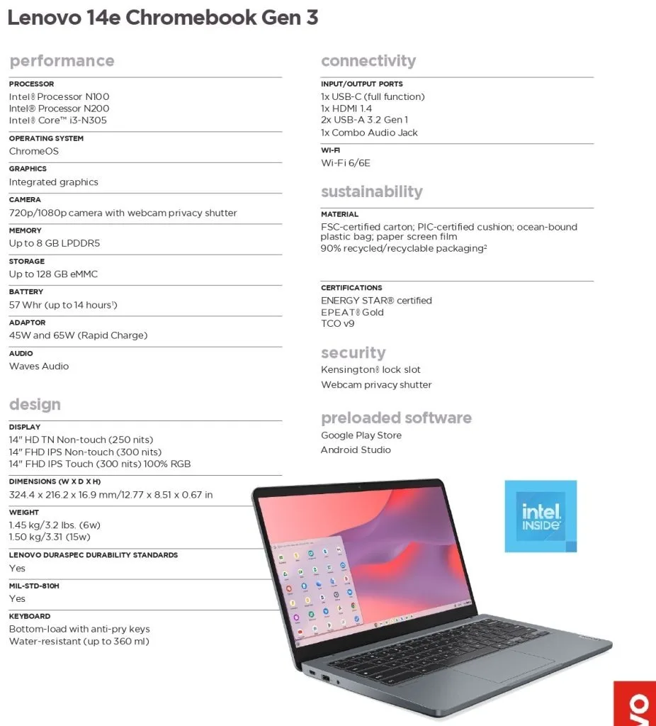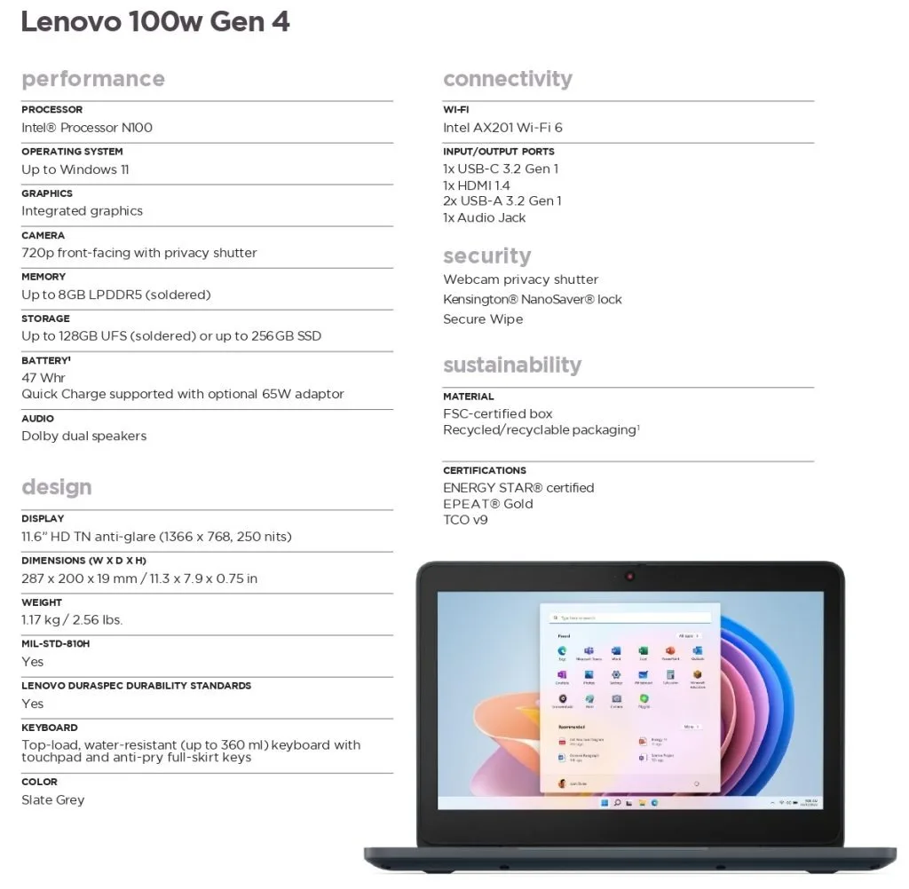 Il est doté d’un écran antireflet de 11,6 pouces, d’un processeur Intel N100, d’une mémoire vive de 8 Go et d’une capacité de stockage de 128 Go, du Wi-Fi 6 pour une connectivité rapide, d’une caméra HD pour un apprentissage hybride, d’un clavier durable avec des ports et des charnières renforcés, et est enregistré EPEAT Gold aux États-Unis, au Canada et en Allemagne.