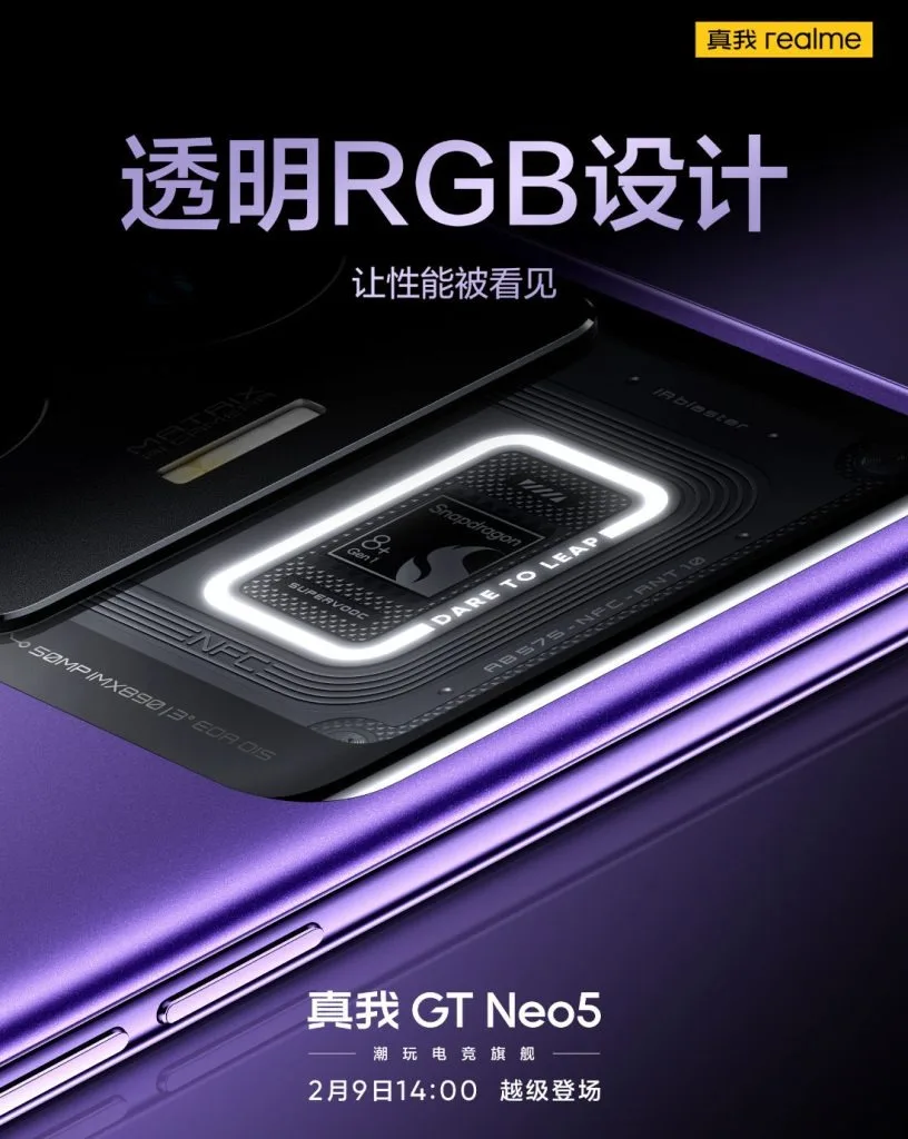 Une image en gros plan postée par Xu Qi Chase, CMO de Realme China, montre que la partie supérieure droite de l’arrière du smartphone a un design transparent, et il y a un cercle de lumières RVB, et il est également écrit « DARE TO LEAP », Snapdragon 8+ Gen 1, SuperVOOC, NFC, et 50 MP IMX890 avec 3° EOA OIS.