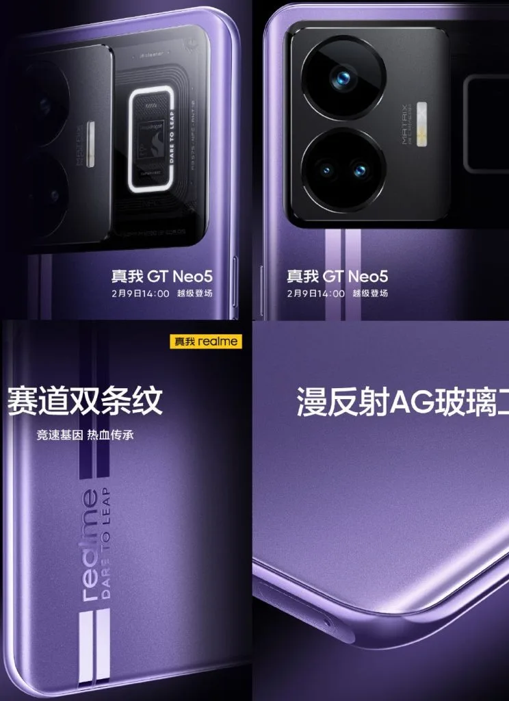 Après le teaser de la conception de l’arrière avec une lumière de respiration, realme a posté l’image arrière complète du smartphone GT Neo5 qui montre le smartphone en couleur violette. Elle montre également le design transparent RVB, qui, selon la société, est inspiré des châssis transparents des appareils de jeu.