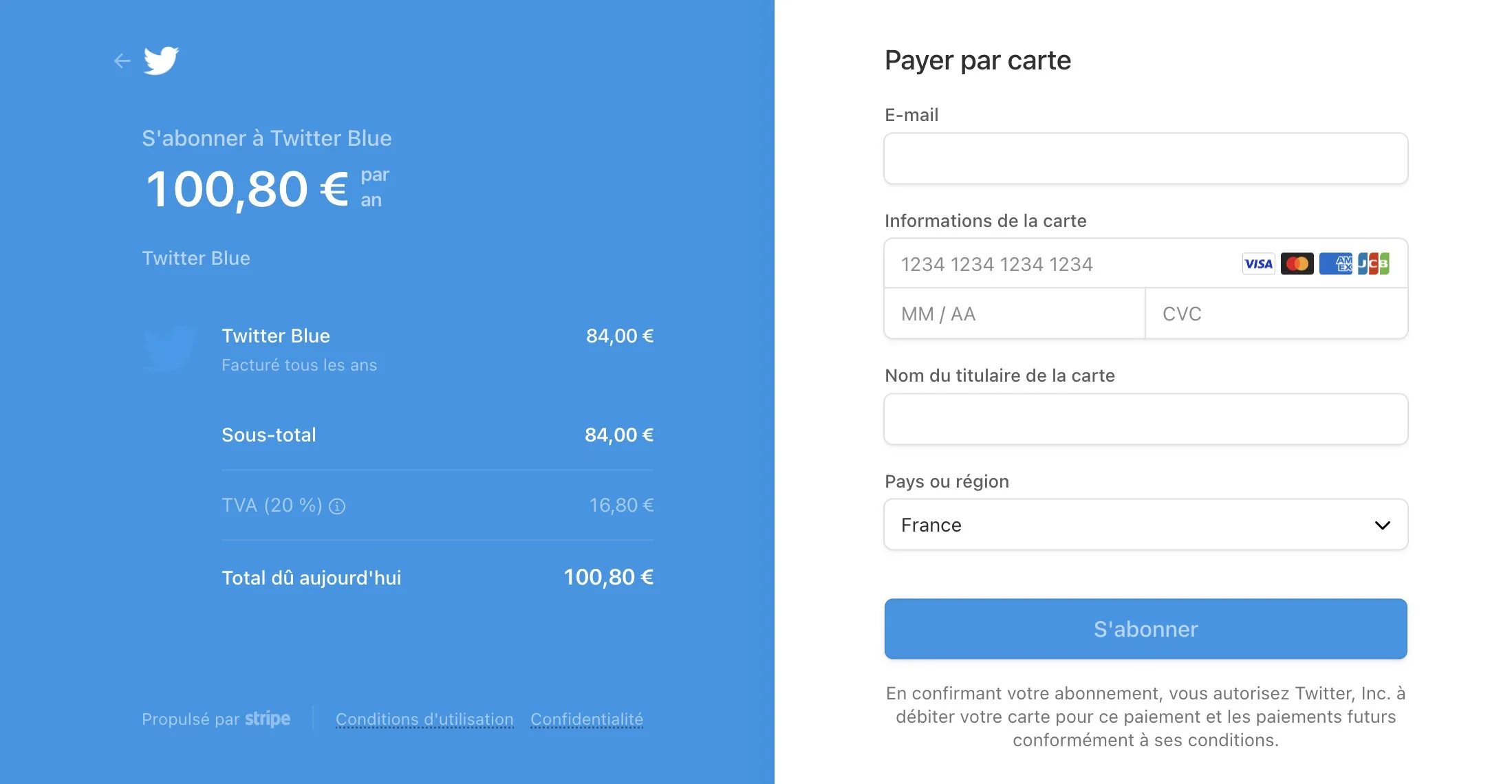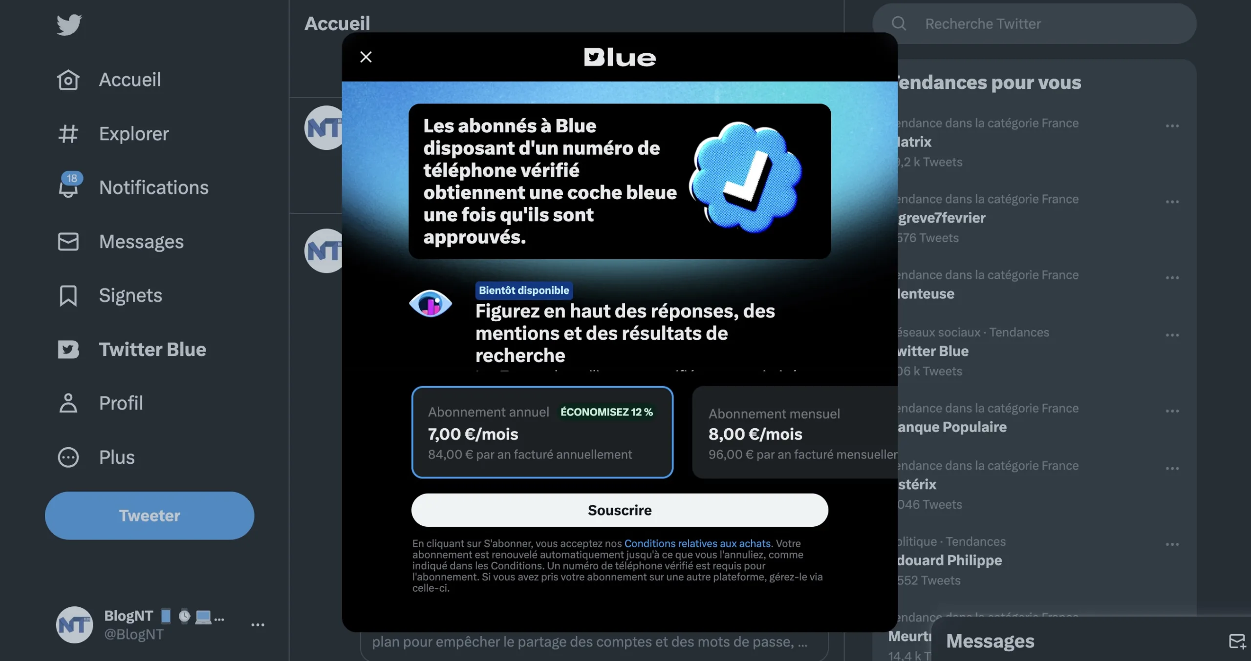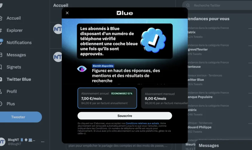 Le nouveau prix de l’abonnement à Twitter Blue varie en fonction de votre région et de votre accès, mais en France, il est de 8 euros par mois, soit 96 euros par an. À noter qu’en prenant en abonnement annuel vous économisez 12 %, soit un abonnement à 7 euros par mois (84 euros l’année). Il convient de souligner qu’il s’agit d’un montant hors taxe, donc dès que vous allez vouloir régler, il faudra débourser réellement 100,80 euros pour l’abonnement annuel à 84 euros.