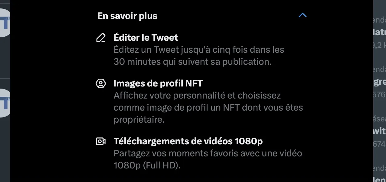 Avec Twitter Blue, vous bénéficiez également d’un accès anticipé aux fonctionnalités de Twitter Blue Labs (fonctionnalités sur lesquelles Twitter travaille, mais qui n’ont pas encore été officiellement publiées). Ces fonctionnalités peuvent inclure la modification du tweet (qui permet aux utilisateurs de modifier leurs tweets), la possibilité de télécharger des vidéos en 1080p, la possibilité de télécharger des vidéos d’une durée maximale de 10 minutes et la possibilité d’ajouter une photo de profil NFT (non-fongible token) à votre profil Twitter.