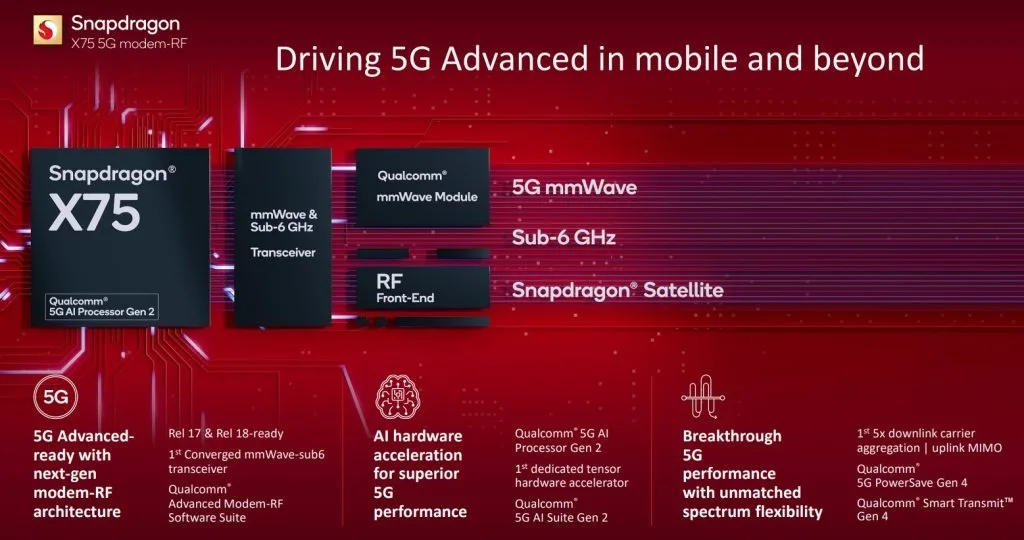 La nouvelle puce modem offrira les améliorations habituelles liées à l’arrivée d’un nouveau silicium plus rapide, mais elle ne se limite pas aux performances brutes. Qualcomm tire parti d’un large éventail de nouvelles capacités qui constituent la nouvelle norme 5G Advanced pour obtenir des vitesses multi-gigabit encore plus rapides grâce à une agrégation de porteuses améliorée et à une meilleure connectivité mmWave qui minimisera les sauts de fréquence pour fournir des connexions plus stables et plus fiables tout en minimisant les interférences. Cela signifie des vitesses plus rapides car les appareils peuvent rester sur les mêmes canaux de manière plus constante. Le X75 sera également capable de transmettre deux signaux simultanés au lieu d’un seul, ce qui permettra d’obtenir des vitesses de liaison montante encore plus rapides.
