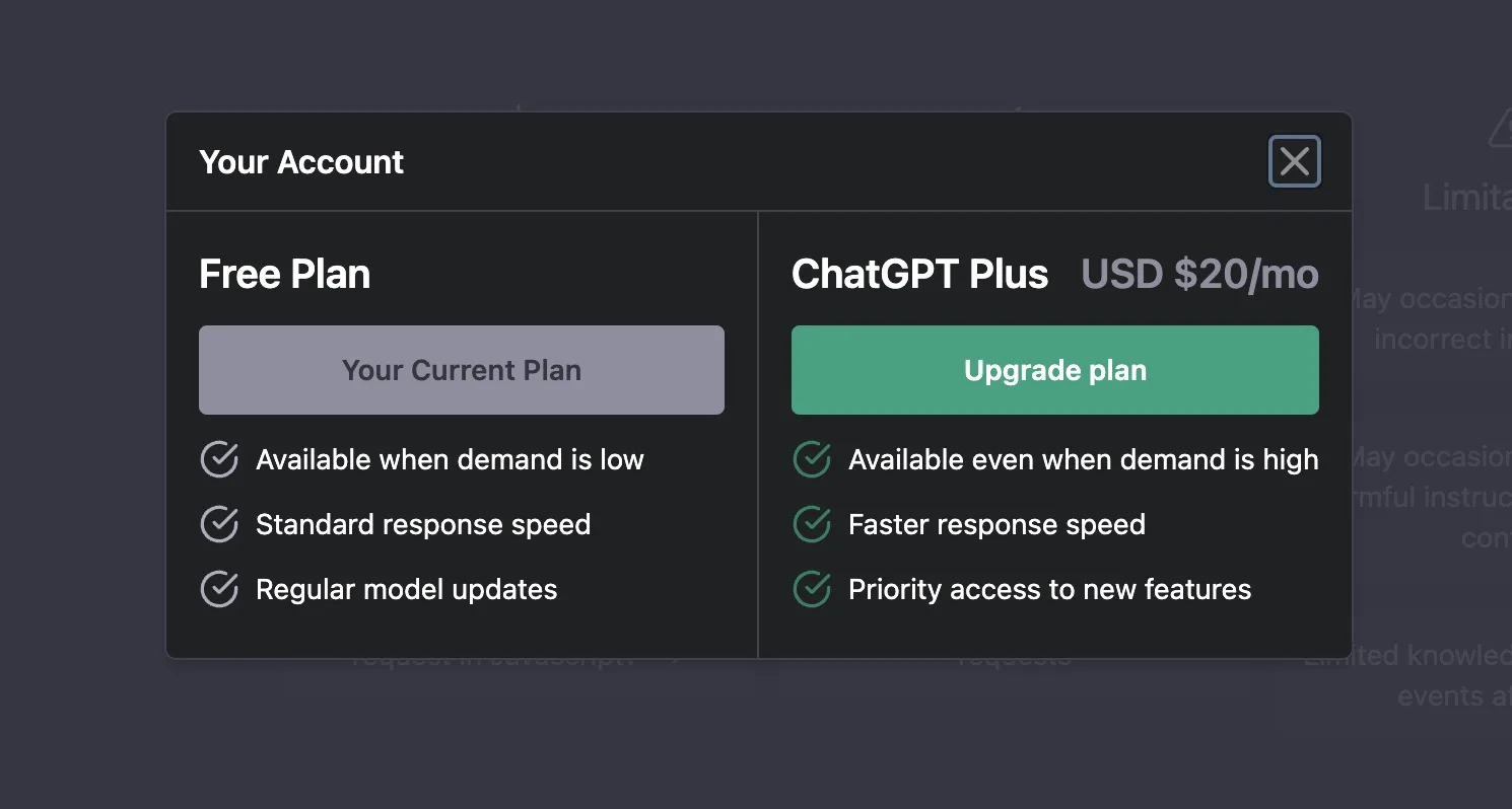 Si vous voulez pouvoir accéder à ChatGPT même pendant les périodes de forte demande, pensez à vous inscrire à ChatGPT Plus (en utilisant le lien en bas de la barre latérale de gauche). Cela coûte 20 dollars par mois et vous donne un accès prioritaire, des réponses plus rapides et de nouvelles fonctionnalités dès qu’elles sont introduites.