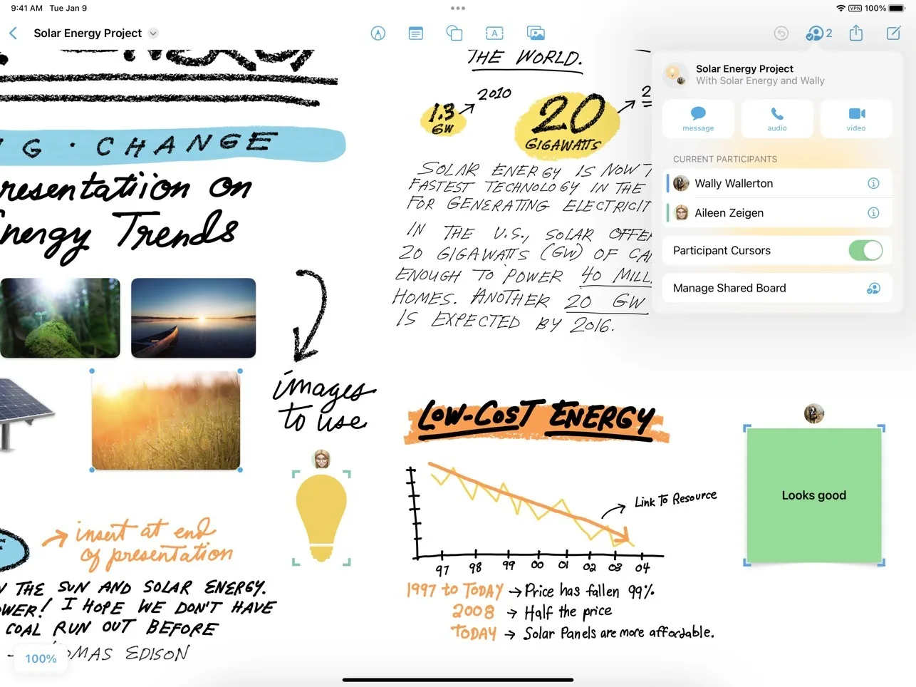 En tant qu’outil de collaboration, Freeform a un sérieux potentiel. Une fois que vous avez invité d’autres personnes à partager vos planches, vous pouvez collaborer en temps réel, avec l’intégration de FaceTime (cliquez ou tapez sur le bouton de collaboration, puis appuyez sur les boutons « Audio » ou « Vidéo » pour commencer).