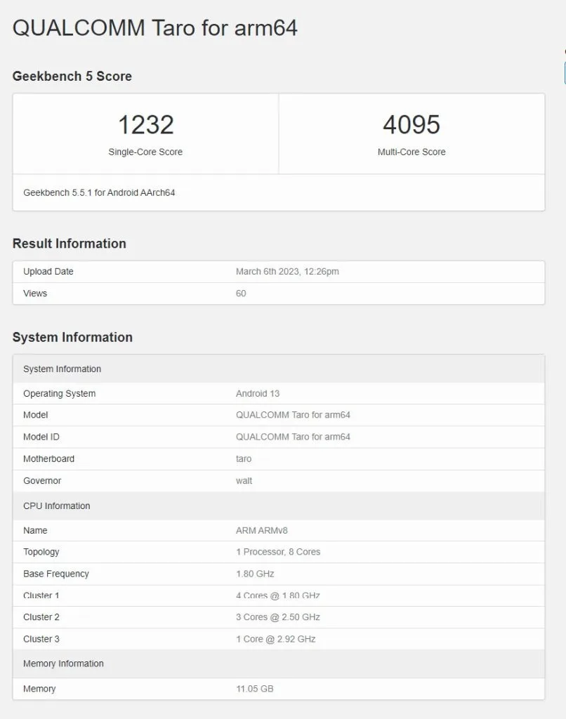Il révèle un score de 1 232 points dans Geekbench monocoeur et 4 095 points dans le benchmark multicœurs. C’est mieux que le Dimensity 8200 et presque au même niveau que le Dimensity 9000 et le Snapdragon 8+ Gen 1 en termes de scores Geekbench.