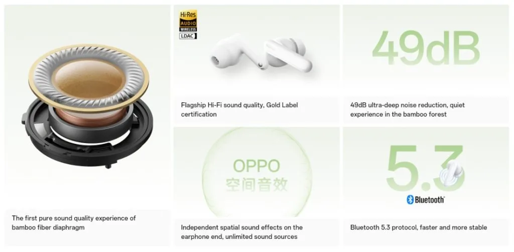 En plus du système LDAC, les écouteurs sont également dotés de l’effet sonore spatial OPPO Alive Audio, un son surround à 8 côtés qui utilise un algorithme développé par l’entreprise pour créer un large champ sonore. Les écouteurs sont dotés d’une connexion multi-appareils et d’une latence ultra-faible de 47 ms pour les jeux.