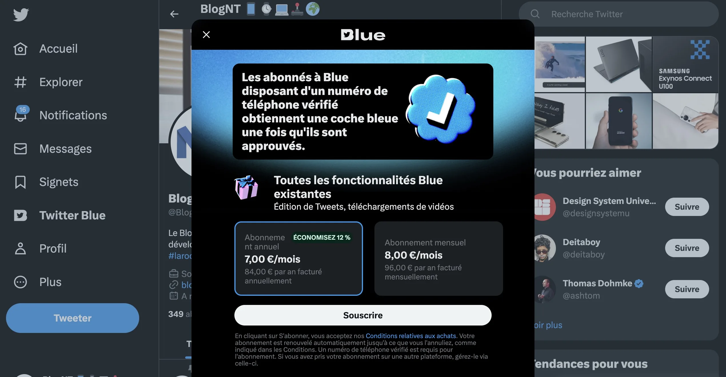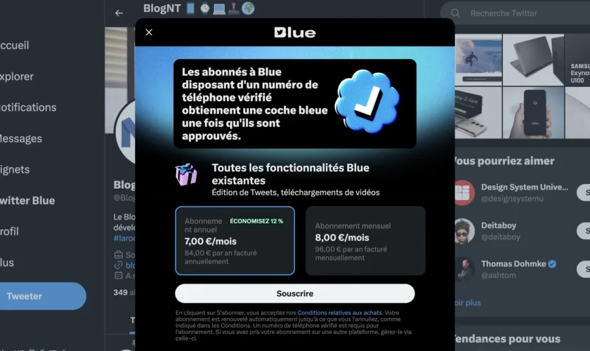 Twitter Blue en France coûte 8 euros par mois, mais vous bénéficiez d’une réduction de 12 % si vous payez pour toute l’année, soit 7 euros par mois pour un total de 84 euros. Si vous voulez en savoir plus, suivez le guide !