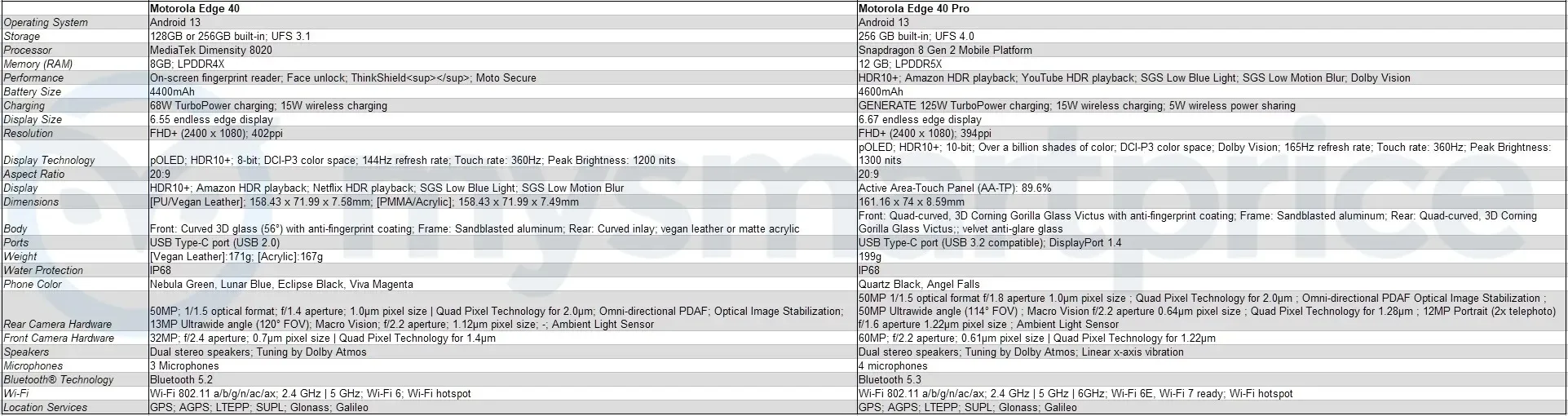 Les Motorola Edge 40 et Edge 40 Pro ont fait l’objet d’une fuite, grâce à MySmartPrice qui cite une source ayant une connaissance directe des spécifications officielles. Le Motorola Edge 40 Pro devrait être essentiellement le même smartphone que le Moto X40, qui a déjà été lancé en Chine, tandis que le Motorola Edge 40 sera un tout nouvel appareil.