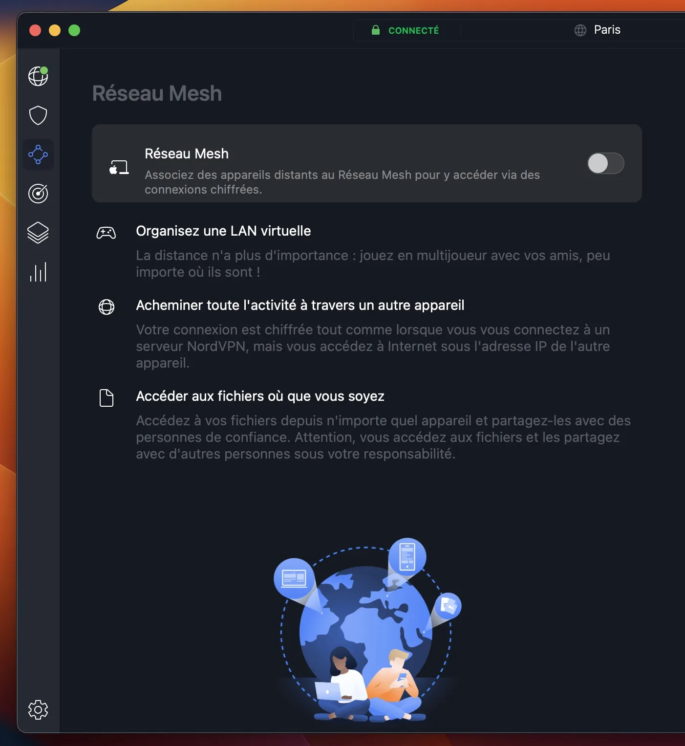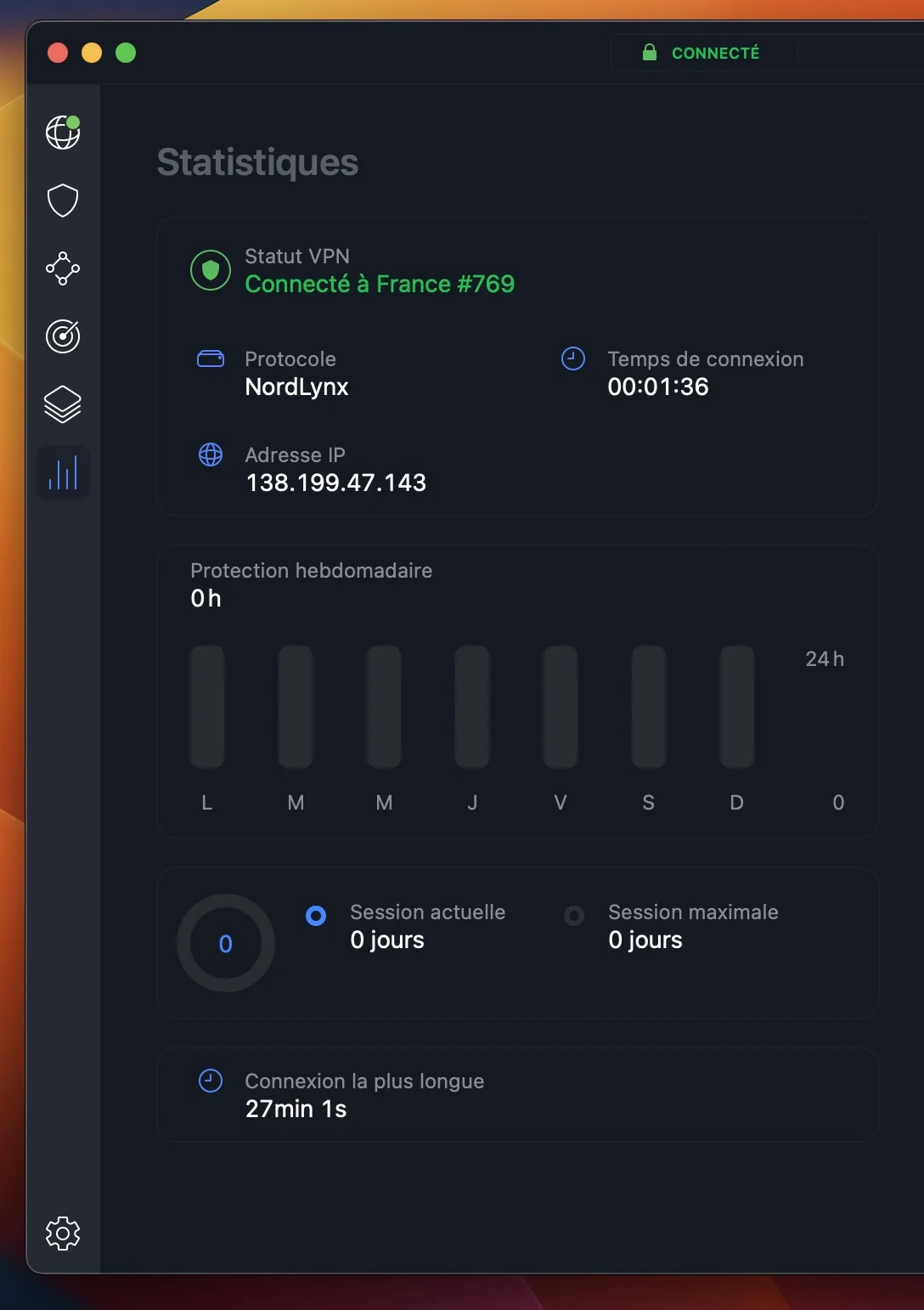 Lorsque vous ouvrez NordVPN pour la première fois, vous êtes confronté à une interface minimaliste et conviviale. La barre de gauche comprend des liens rapides pour le VPN, la protection contre les menaces, la connectivité Mesh et la surveillance du Dark Web.
