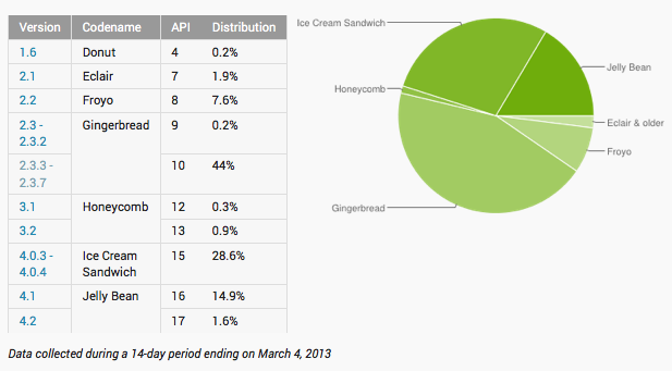 Plus précisément, 16,5% des utilisateurs d’Android utilisent Jelly Bean, 28,6% utilisent ICS, 1,2% sont en Honeycomb, 44,2% d’entre vous êtes coincé avec Gingerbread, et malheureusement 7,6% sont encore sur Froyo. Voici à quoi ça ressemble dans le graphique et sous forme de tableau :