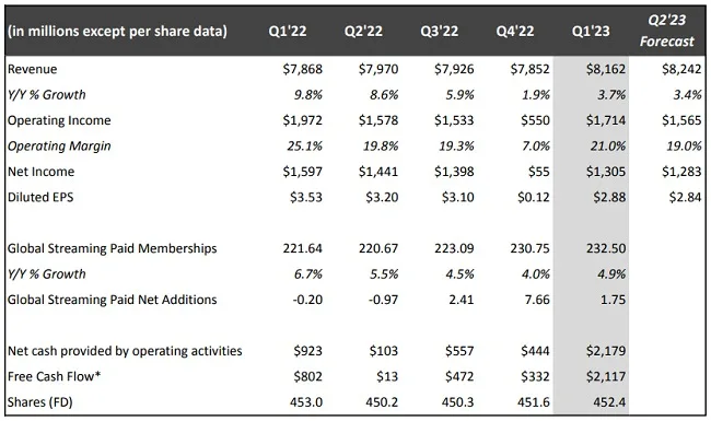 Au cours du premier trimestre, l’option d’abonnement à la publicité de Netflix a été mise à la disposition des abonnés pour le premier trimestre complet. Le chiffre d’affaires de Netflix pour le trimestre s’est élevé à 8,2 milliards de dollars, en hausse de 3,7 % par rapport à l’année précédente, et il a dépassé les attentes en matière de bénéfices avec un BPA dilué de 2,88 dollars sur un bénéfice net de 1,3 milliard de dollars. Le flux de trésorerie disponible de Netflix s’est élevé à 2,1 milliards de dollars, et son résultat d’exploitation à 1,7 milliard de dollars, avec une marge d’exploitation de 21 %.