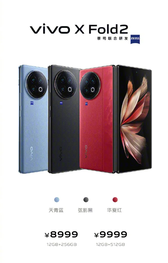 Le vivo X Fold2 est disponible dans les coloris Shadow Black, China Red et Azure Blue au prix de 8999 yuans (environ 1 200 euros) pour les modèles 12 Go de RAM + 256 Go de stockage et 9999 yuans (environ 1 350 euros) pour les modèles 12 Go de RAM et 512 Go de stockage.