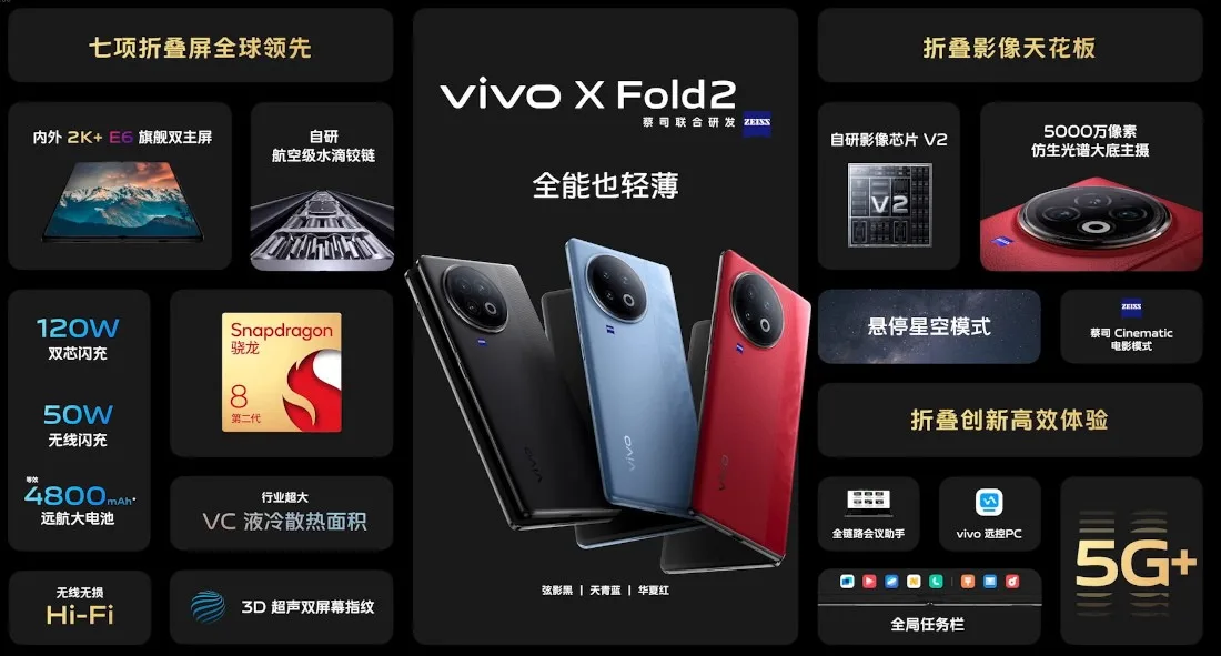 Le smartphone est équipé d’un SoC Snapdragon 8 Gen 2 et d’une mémoire vive de 12 Go. Le X Fold2 est équipé d’une puce de sécurité SPU de nouvelle génération, exclusive à l’industrie, qui offre une protection complète de la sécurité et de la vie privée. Le X Fold2 dispose d’une surface de dissipation thermique de 2448 mm², la plus grande surface de dissipation thermique du refroidissement liquide VC de l’industrie, a ajouté la société.