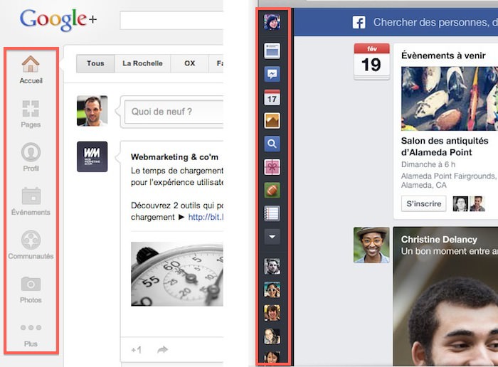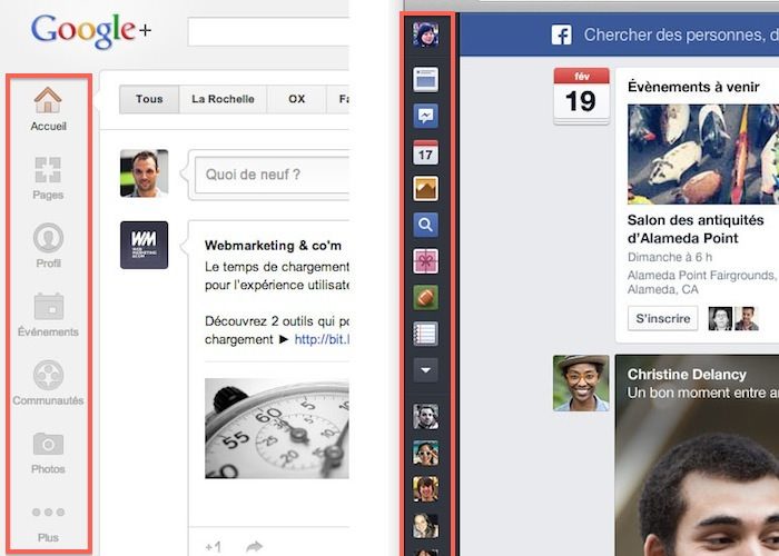 En mettant côte à côte les conceptions des deux flux, les similitudes sont évidentes. La première chose qui frappe l’oeil, c’est la barre de navigation. Dès qu’on la connaissait sur le réseau social, celle-ci était présente en haut pour accéder à des fonctionnalités de base – message privé, notification, etc … – et un menu latéral pour accéder à des “sous fonctionnalités”. Aujourd’hui, enfin dans quelques semaines lorsque l’on aura tous accès à ce nouveau design, nous allons avoir accès aux différentes fonctionnalités du service depuis une barre latérale, plus design, moins fouillis, et qui affiche de jolies petites icônes très visuelles en tant que signets – comme les messages privées ou encore le chat. Maintenant regardez le montage ci-dessous. Il se passe de commentaires non ?