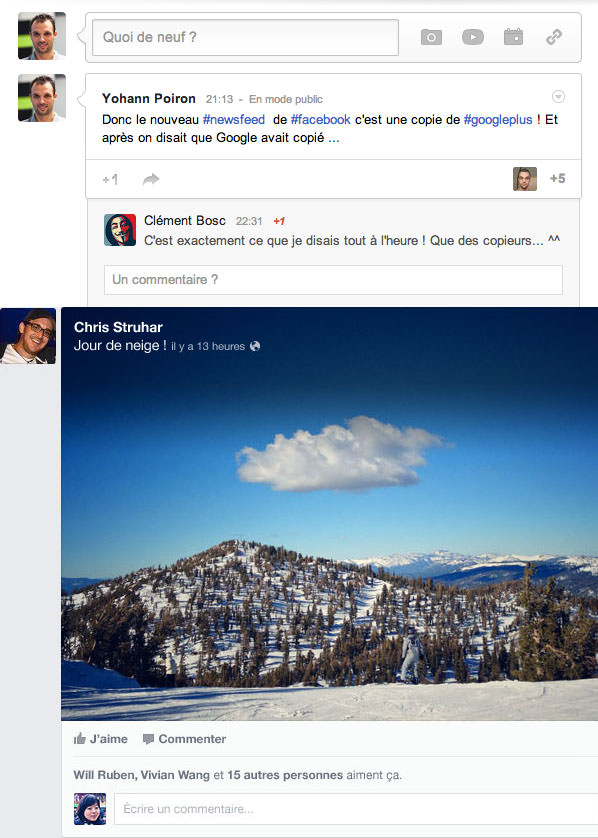 En effet, seulement quelques minutes après que Facebook ait dévoilé le nouveau design, offrant la possibilité de configurer de multiples flux, de rendre cohérent les expériences mobiles – smartphone et tablette – et en mettant davantage l’accent sur les photos, les utilisateurs sont allés sur Twitter pour discuter des similitudes entre la mise à jour et le design actuel de Google+, un de ses concurrents, allant jusqu’à être en trending topic dans certains régions du globe, et notamment aux États-Unis.