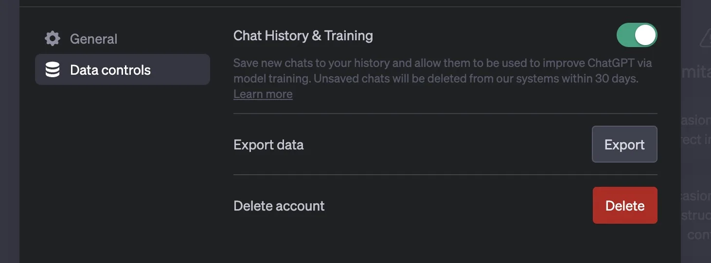- Désactiver l’historique de ChatGPT : Dans la fenêtre des paramètres, à côté de Data Controls, désactivez l’option « Chat History & Training », et vous avez terminé