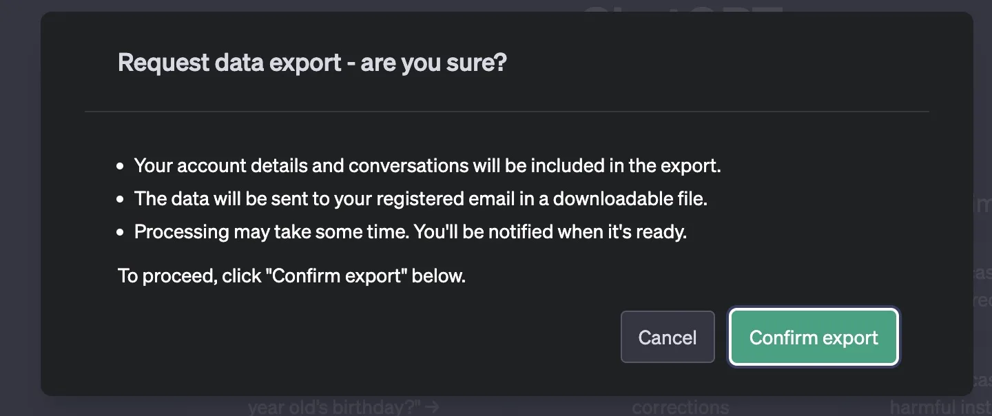 - Lisez les détails énumérés et cliquez sur « Confirm export » pour que les données soient envoyées par e-mail