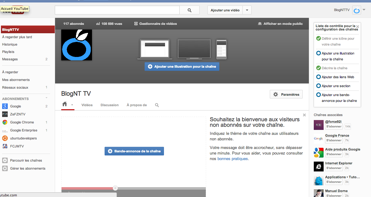 De plus, afin de vous aider dans la mise en œuvre du nouveau design de votre chaîne, le géant de la recherche a pensé à tout. En effet, un encart sur la droite permet à tous ceux qui disposent d’une chaîne YouTube et qui sont passés sur la nouvelle conception de lister tous les points de contrôle pour la configuration de votre chaîne. Parmi ces derniers on retrouve la mise en place d’une icône pour votre chaîne, de l’ajout d’une illustration, sa description, les liens vers les différents sites web, la mise en œuvre des sections ou encore l’ajout d’une bande-annonce pour la chaîne qui se lancera automatiquement lorsqu’un utilisateur va parcourir votre chaîne sans être abonné.