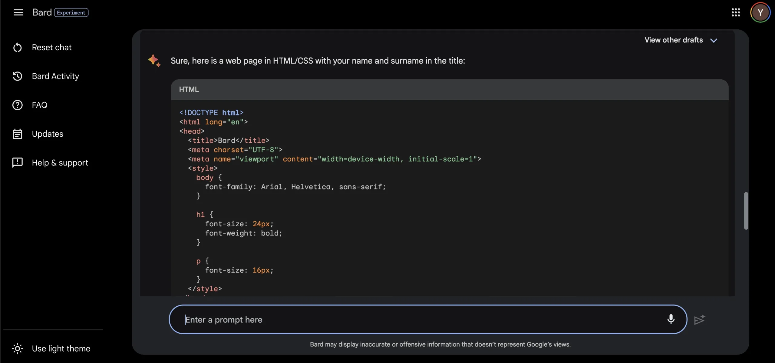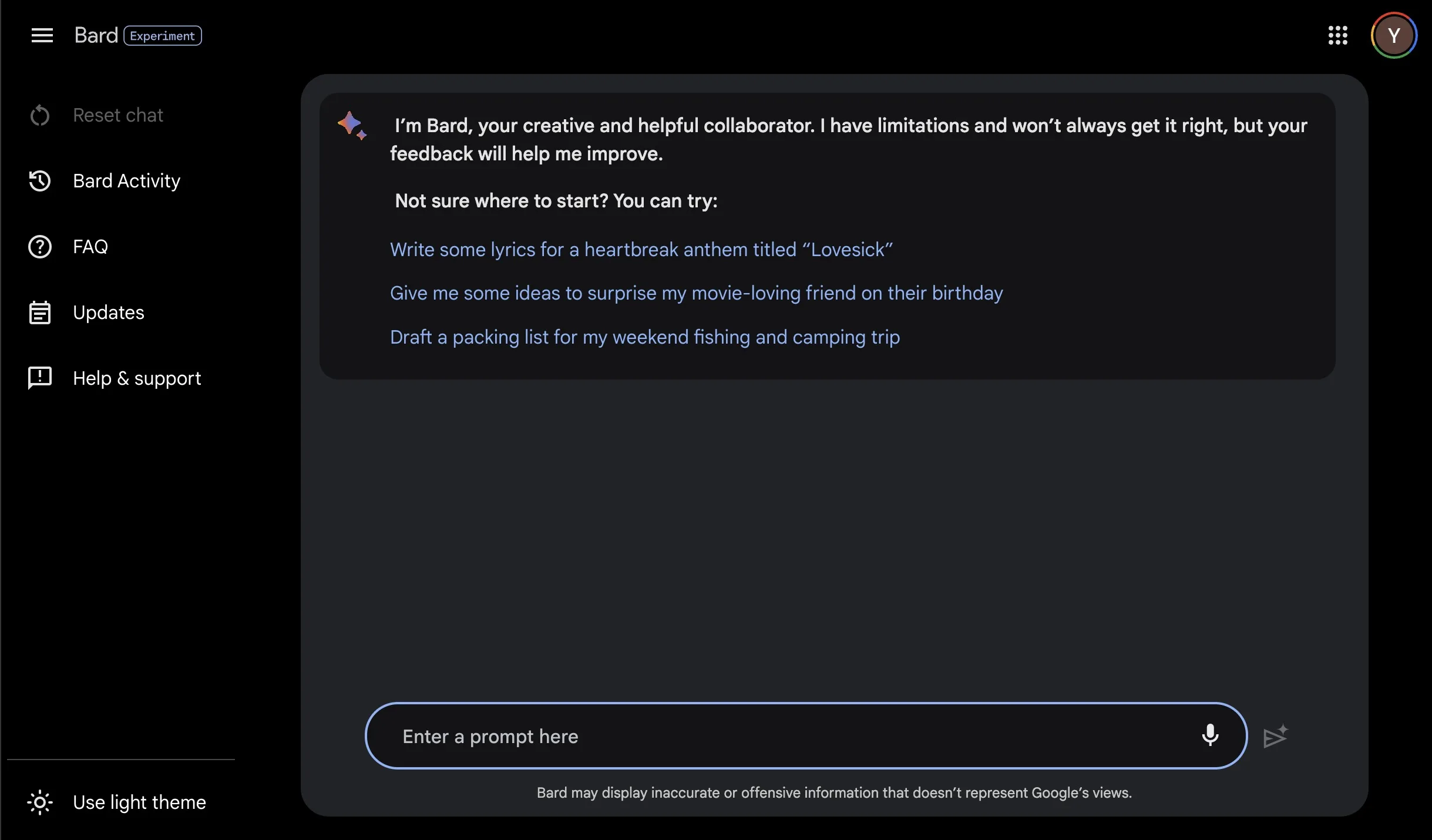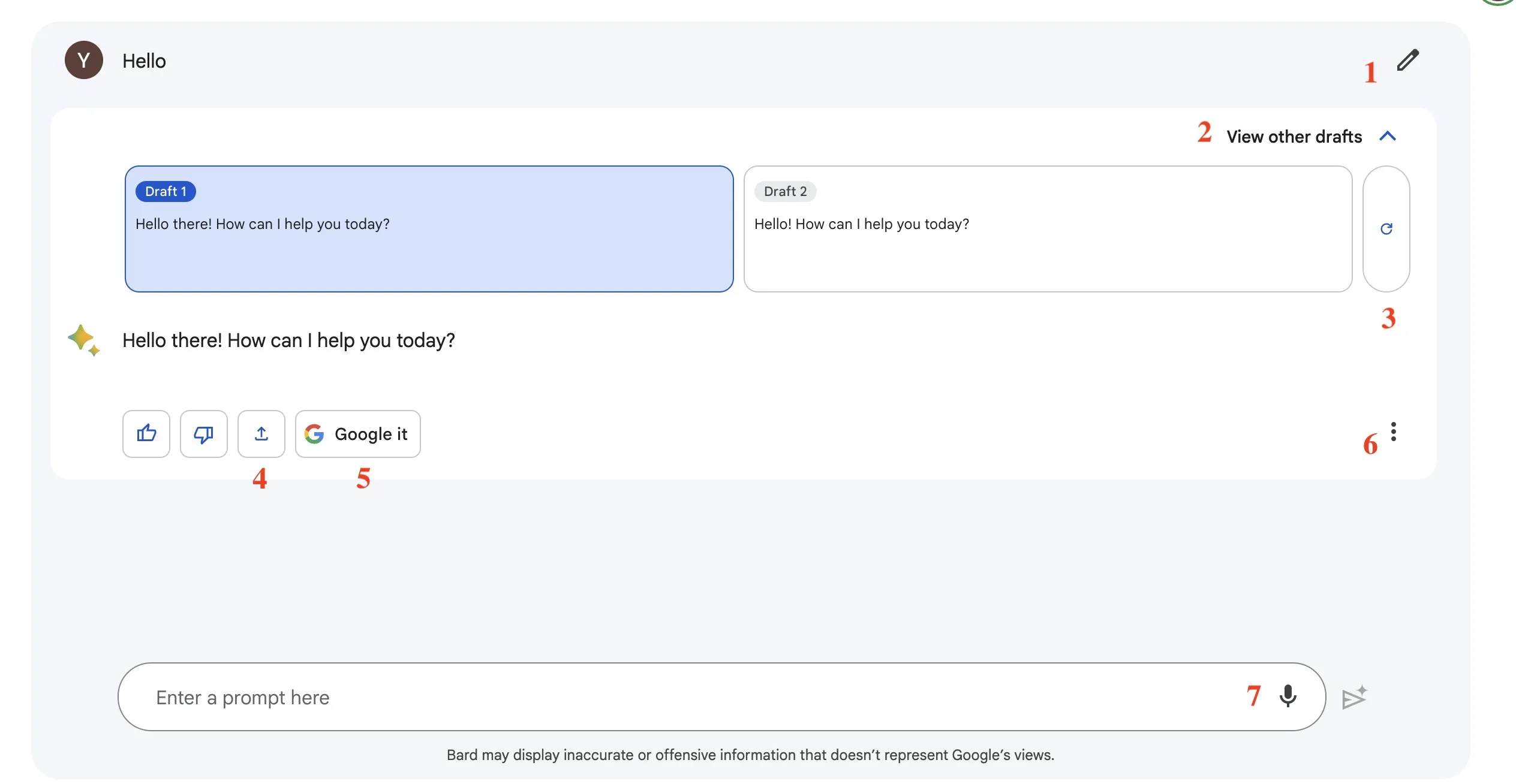 - Pour commencer à chatter, saisissez une question dans la zone de texte « Enter a Prompt here » (Saisissez une question ici) et Bard rédigera une réponse en quelques secondes